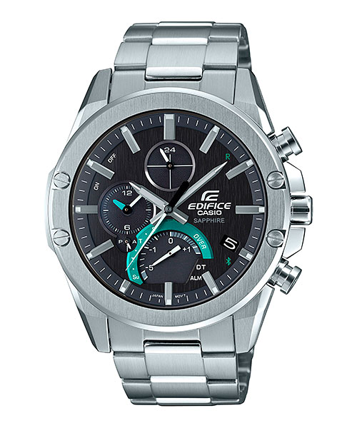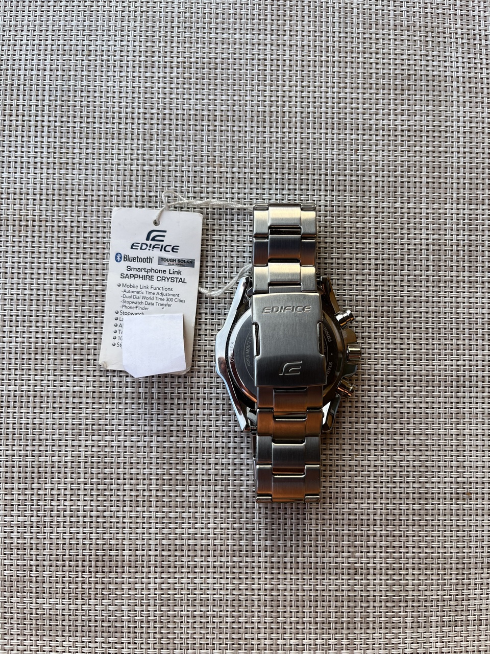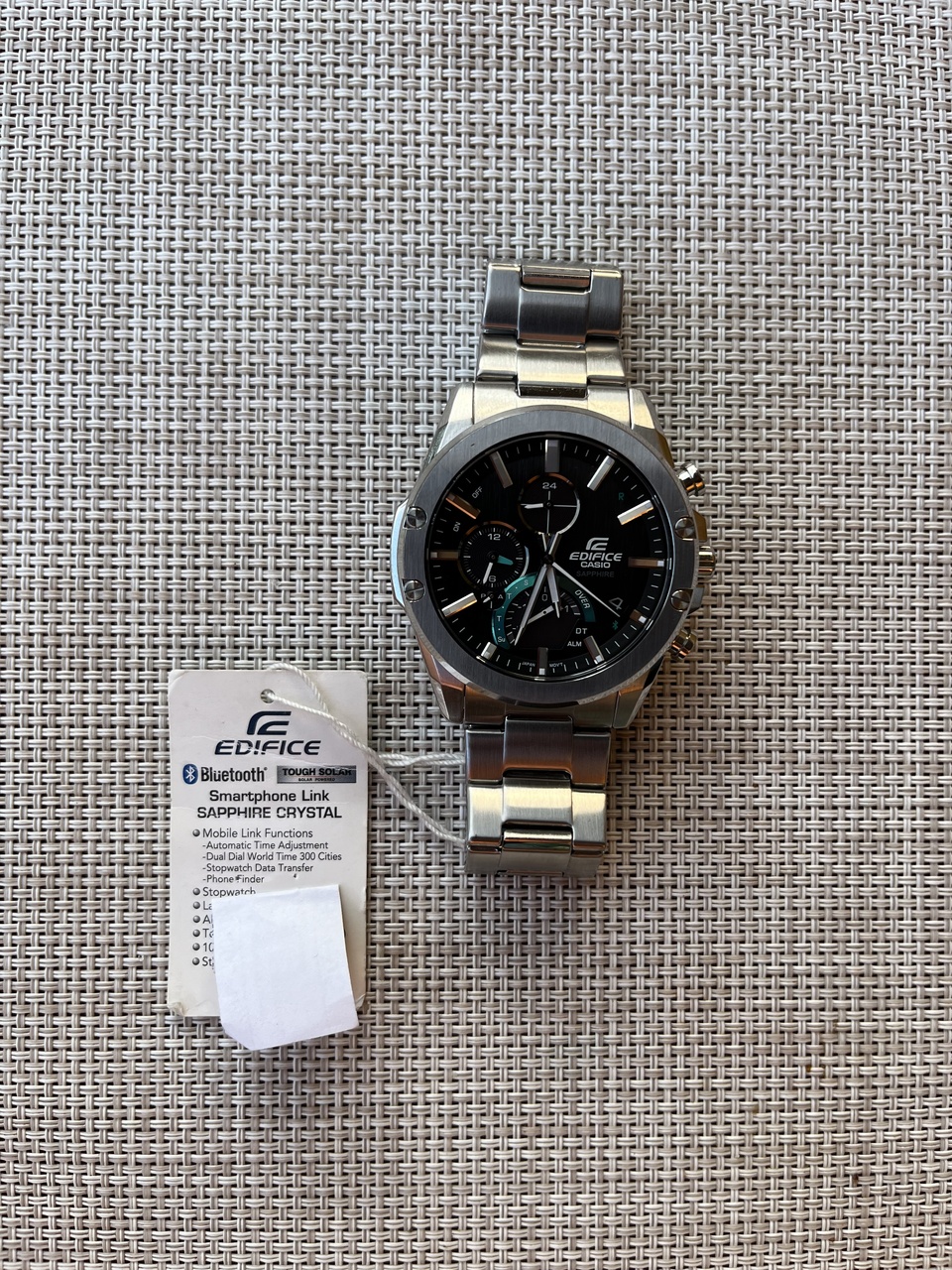 По сути перед нами самый яркий представитель бренда Edifice, а именно с самыми “прокачанными” возможностями. Сапфировое стекло с антибликовым покрытием, солнечное питание, Bluetooth синхронизация с телефоном и очень тонкий корпус. 8,9 мм — толщина корпуса у EQB-1000. Для сравнения — у предыдущих моделей [EQB-900 и EQB-800] этот параметр равняется 12 и 13,1 мм соответственно. Ну и подключение к телефону – вторая основная фишка серии EQB-1000.Делается это в первую очередь для точности и для удобства использования аналоговых функций. Выбрать время в другом часовом поясе? – не вопрос, ищете город в приложении Edifice Connected и теперь у вас в дополнительном окошке нужное время.