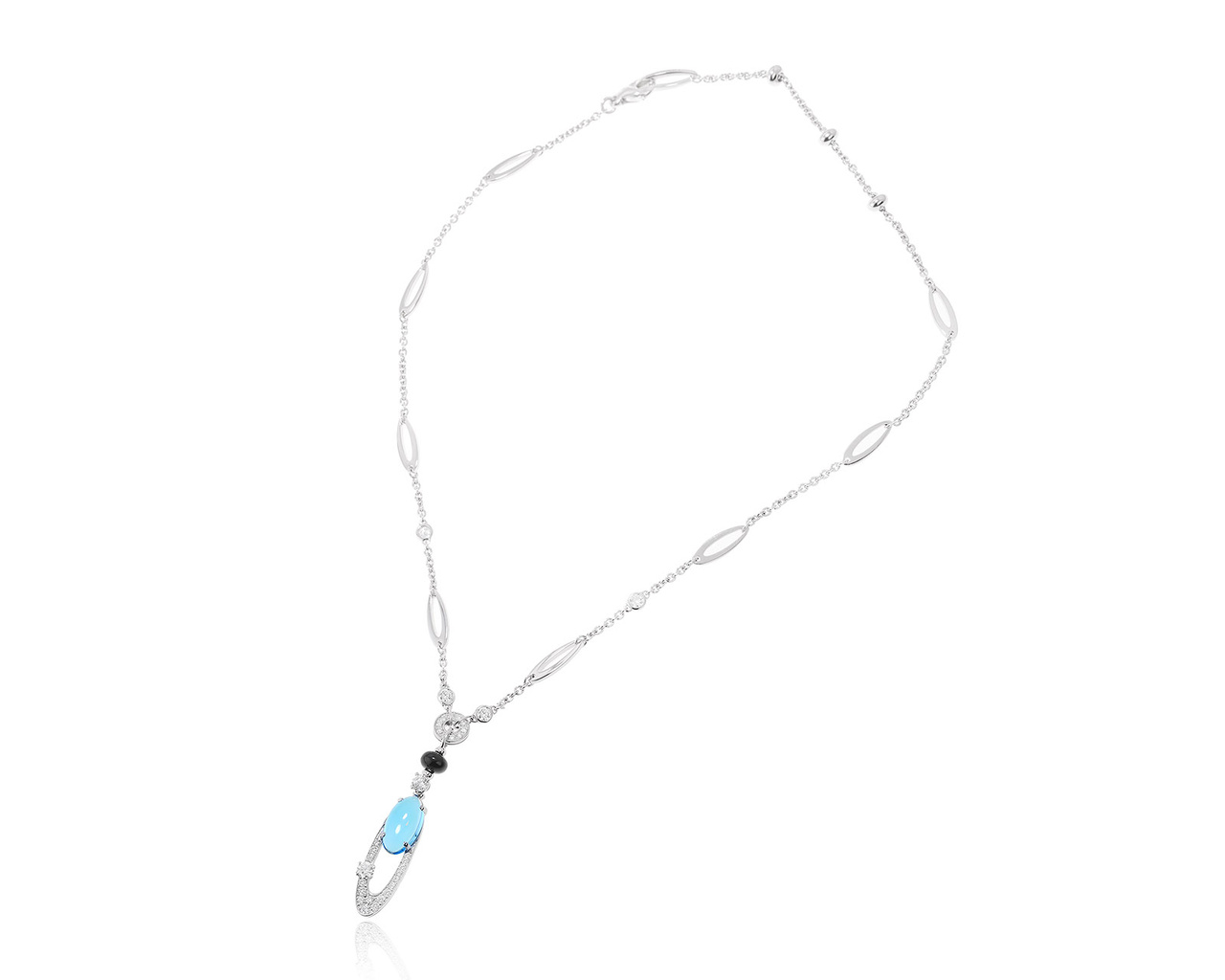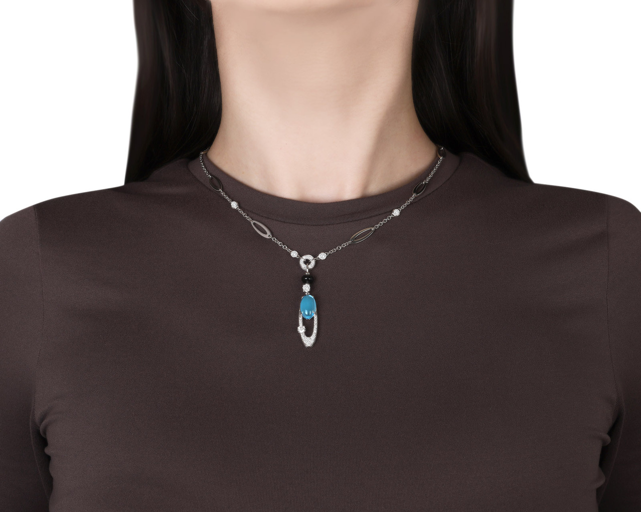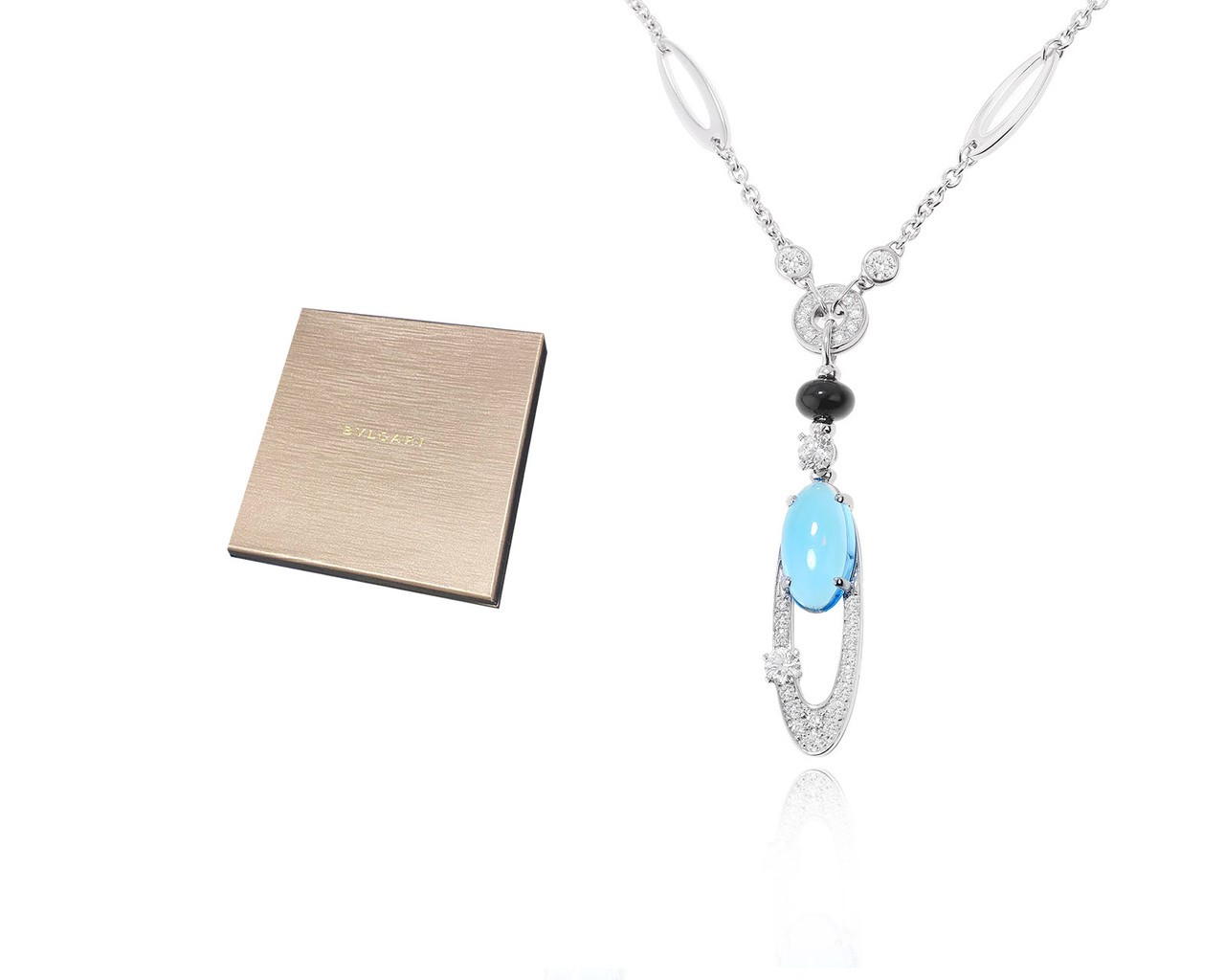 Оригинальное золотое колье с голубым топазом 3.90ct, черным ониксом 1.05ct и бриллиантами 1.26ct от всемирно известного бренда Bvlgari из коллекции Elisia.