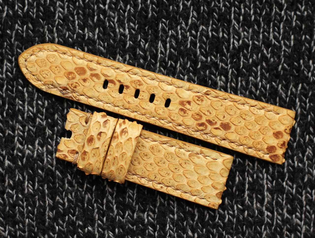 Желтый питон, с коричневыми акцентами. Чешуйки выступающие, фактурные. Толстая бежевая строчка. Ширина 24/22 мм, длина 125/75 мм, толщина около 3.5 мм, мягкий. Подклад из бутылочной гипоаллергенной козочки, края окрашены полиуретановой матовой краской в цвет. Выделка лица и подклада - Италия. Две шлевки, подвижная и вшитая.
