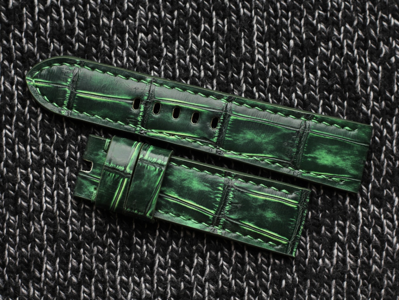 Ярко-зеленый крок с агатовым финишем и потертостями. Косая строчка в цвет. Ширина 24/22 мм, длина 125/80 мм, толщина около 4-4,5 мм, средне жесткий (толщина обязывает : ) Подклад из черной гипоаллергенной козы Antiba, края окрашены полиуретановой матовой краской в цвет. Выделка лица и подклада - Италия. Две шлевки, подвижная и вшитая.