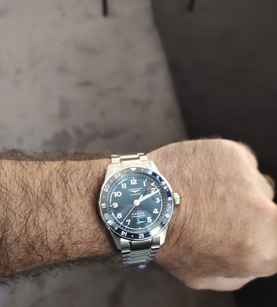 Размер на мужскую руку 42 мм, толщина 13,9 мм, сапфир с антибликом, керамический безель, калибр L844.4 с сертификатом COSC и запасом хода 72 часа