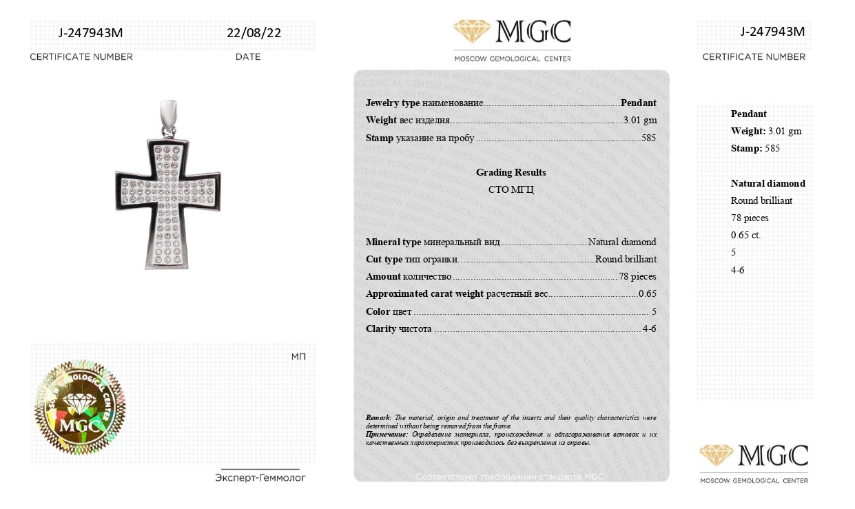 Подвеска-крест из белого золота с бриллиантами 0,65 карат (сертификат МГЦ)