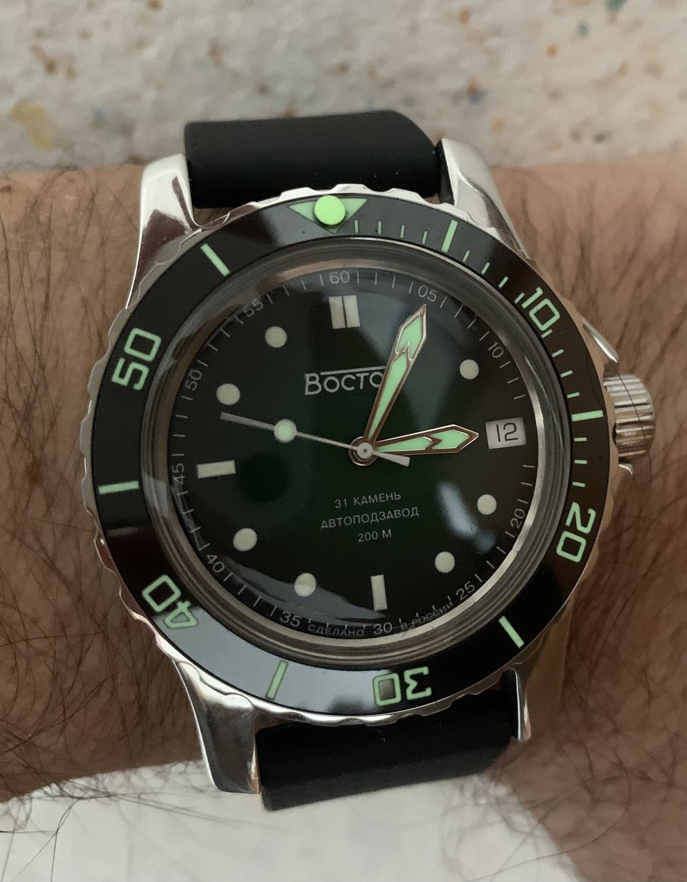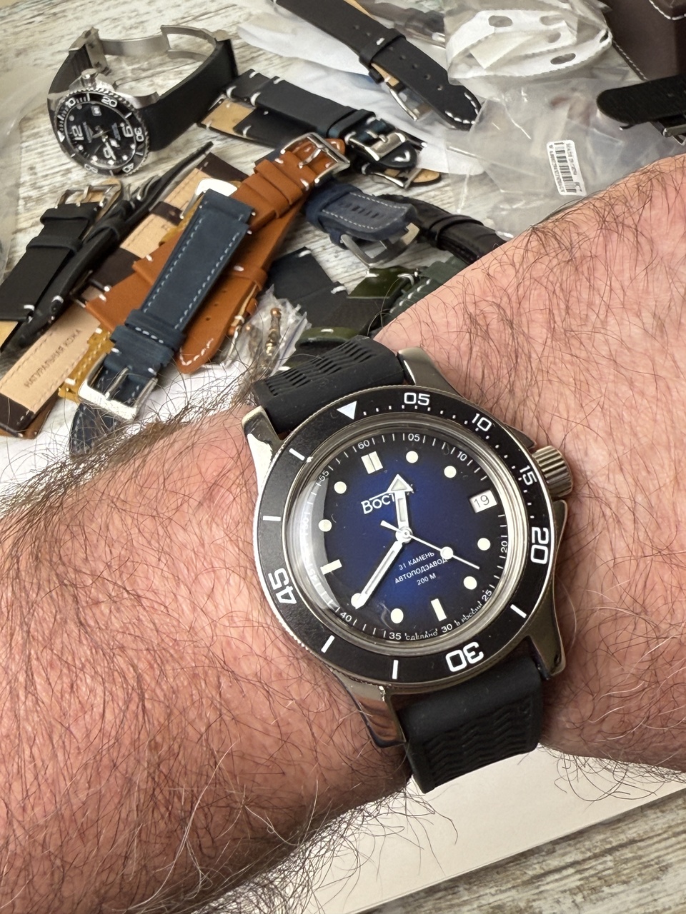 Очень нравится 130 корпус. Ношу свои больше 2 лет. Базель в керамикой с Меранома, стрелки от Фафинова и ремешок из F-каучука с Али.