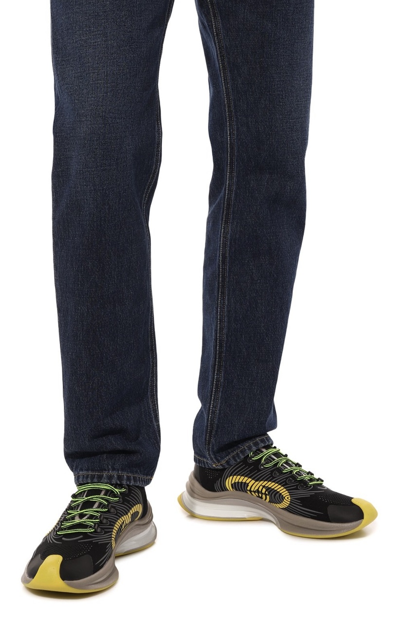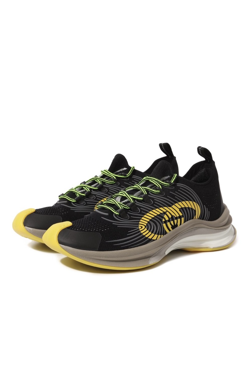 Динамичные линии на подошве кажутся застывшими на мгновенье волнами, а рельефный полимерный узор сбоку - потоками ветра. Лимонно-желтые накладки на узких серых полосках складываются в инициалы Гуччио Гуччи и перекликаются с ярким протектором и шнуровкой. Модель из легкого сетчатого трикотажа вошла в весенне-летнюю коллекцию.