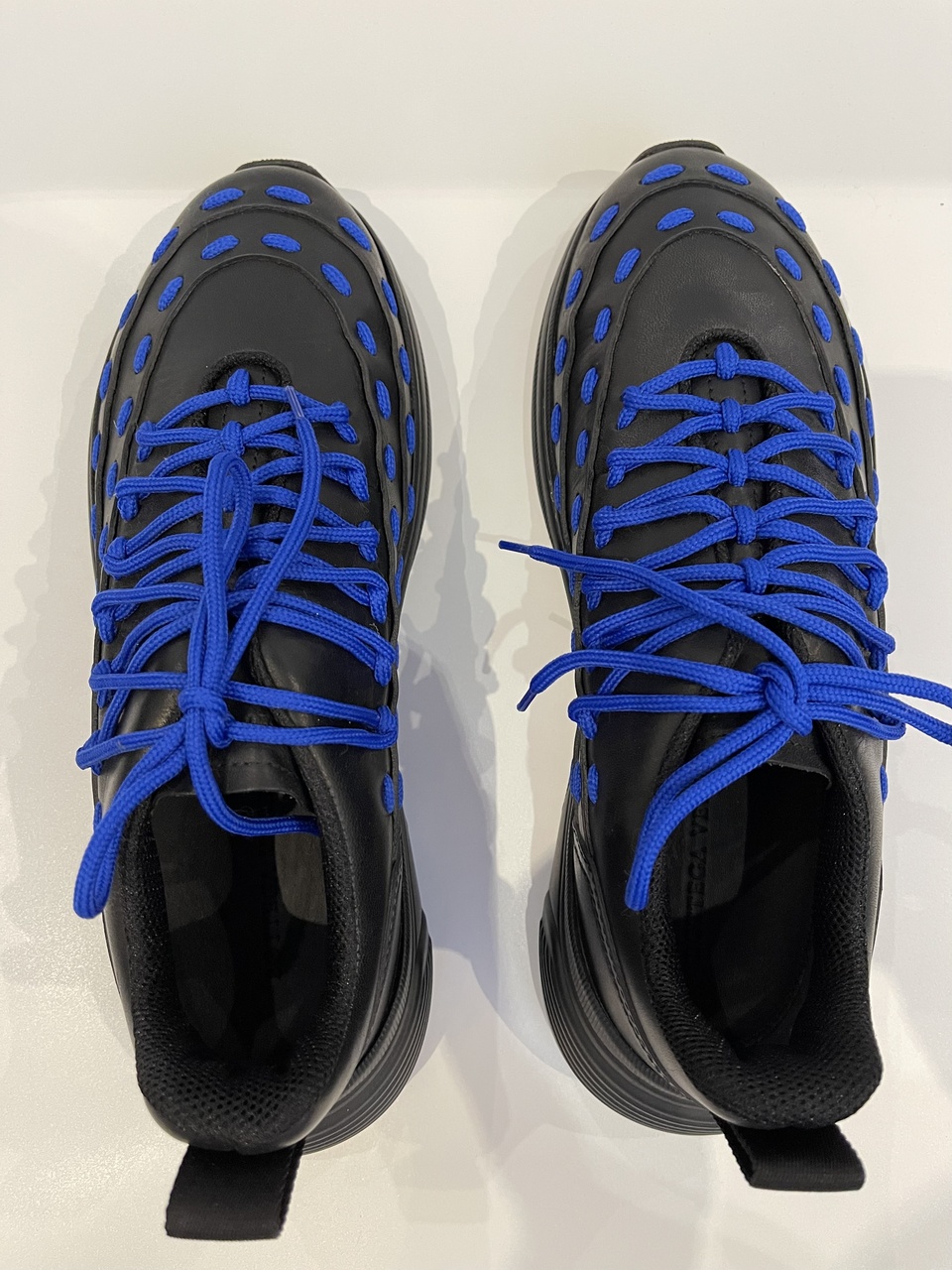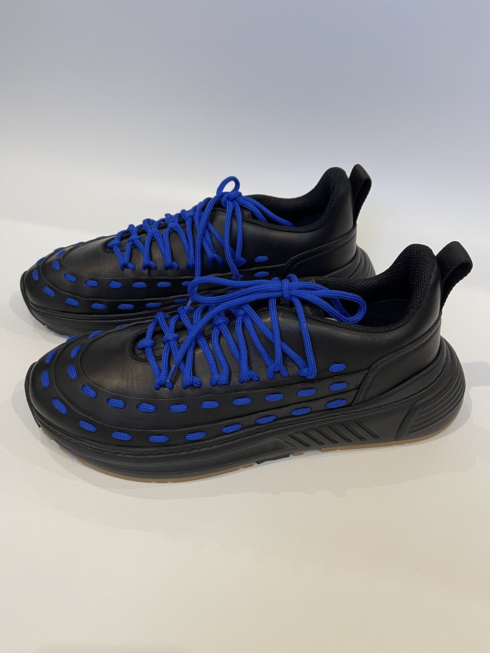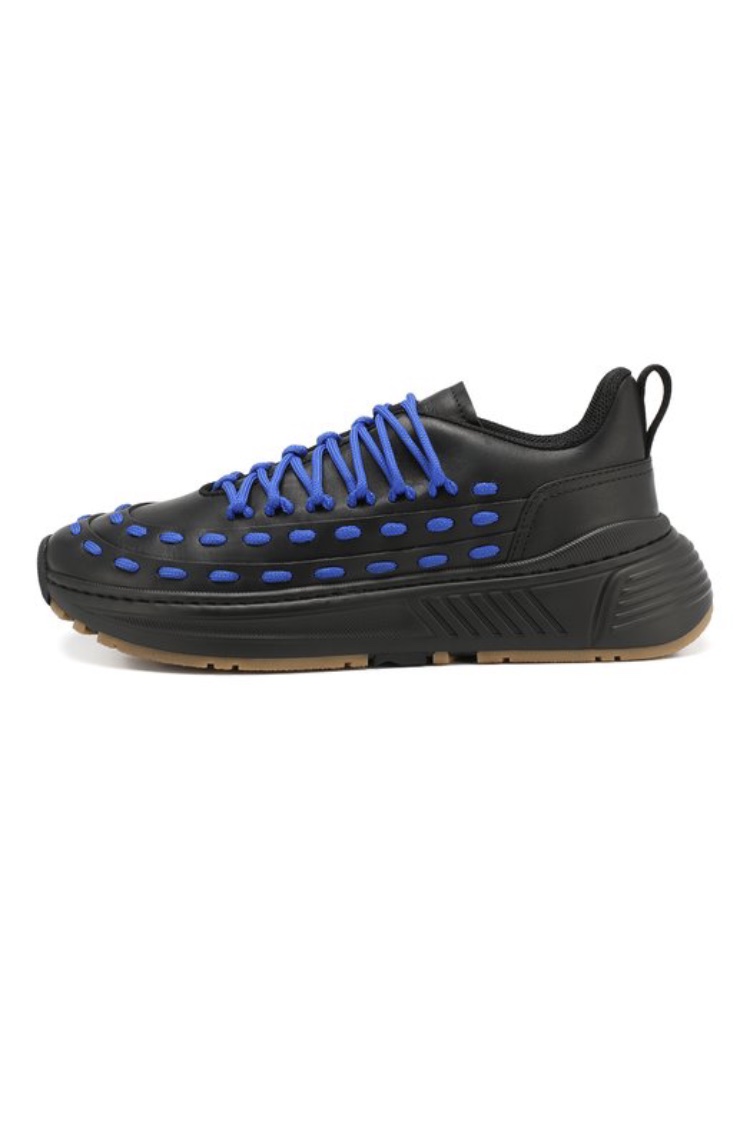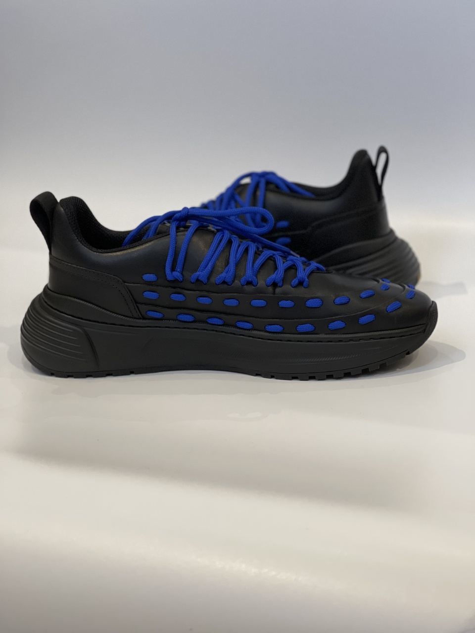 Чёрные кроссовки не выглядят просто благодаря шнуровке оттенка синий электрик и двойному стичингу ей в тон.Обувь изготовили из гладкой матовой кожи растительного дубления,поэтому она получилась особенно мягкой и эластичной.