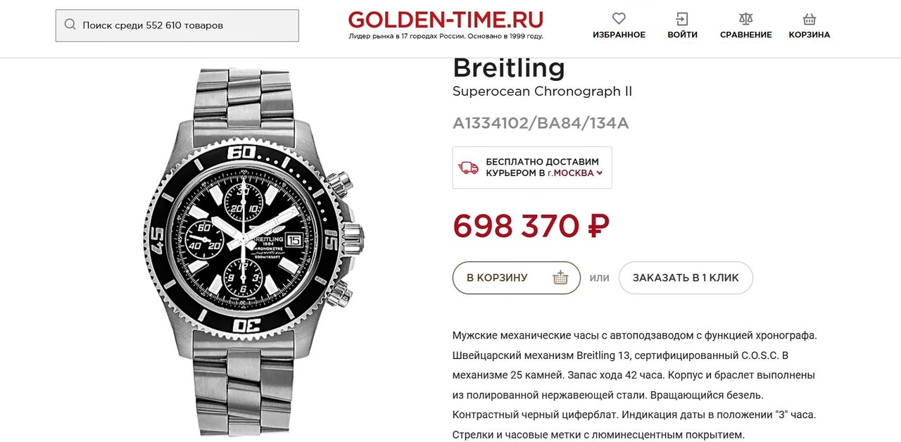 Строгость, лаконичность, простота и изысканность форм в сочетании с непревзойденным качеством являются основными характеристиками хронографа компании Breitling. Его функциональность является неотъемлемым элементом для тех, кто не мыслит своей жизни без скорости и дайвинга. Часы из модельного ряда Superocean от Breitling отличаются предельной прочностью, надежностью, бескомпромиссным качеством. Выполненные в спортивном стиле, они помогают ориентироваться не только на суше, но и насколько по времени хватит кислорода в баллоне, а так же рассчитать время на всплытие.