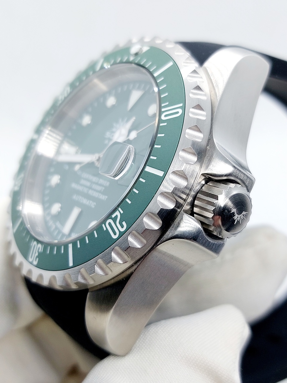 Однонаправленный рифленый безель на 120 щелчков из нержавеющей стали украшен матовой керамической полосой зеленого цвета с минутными метками.