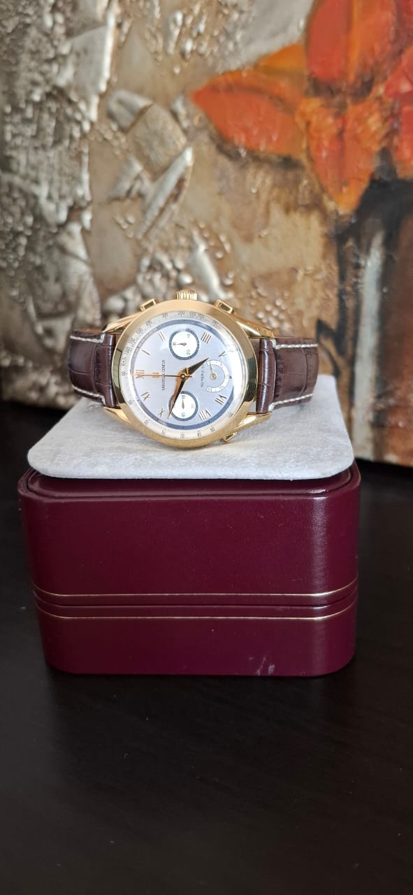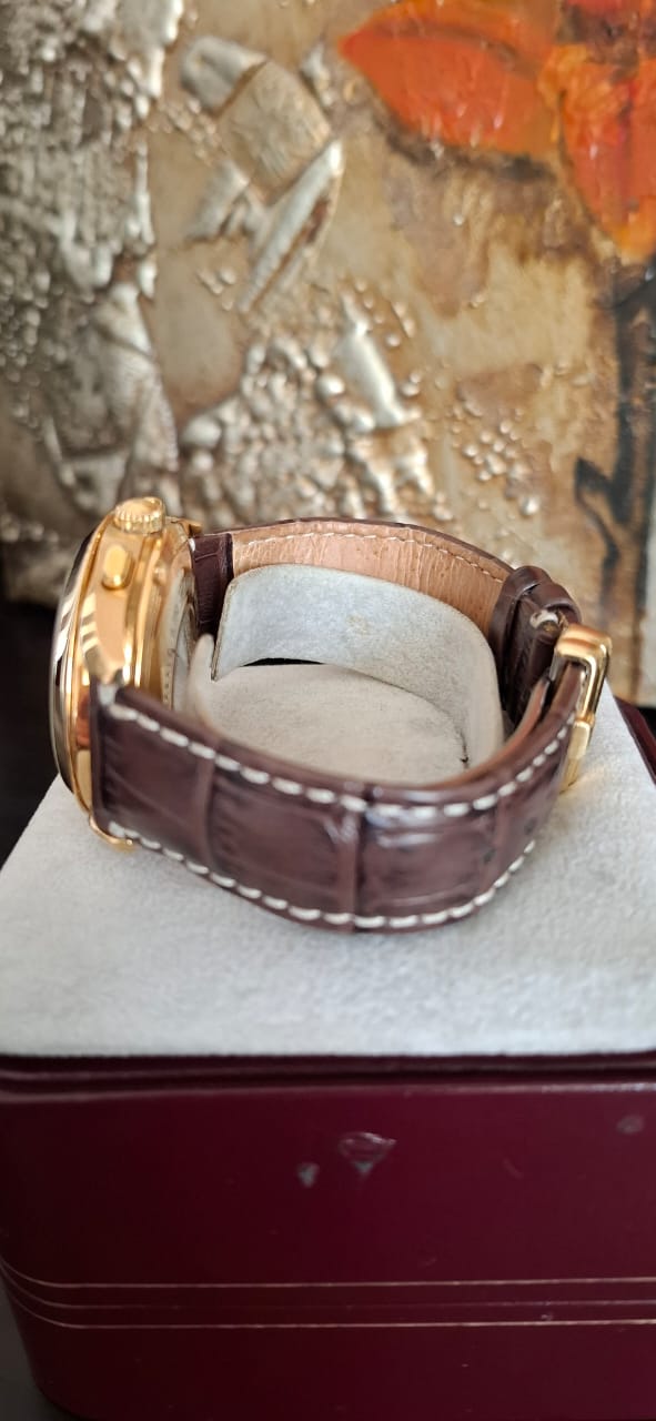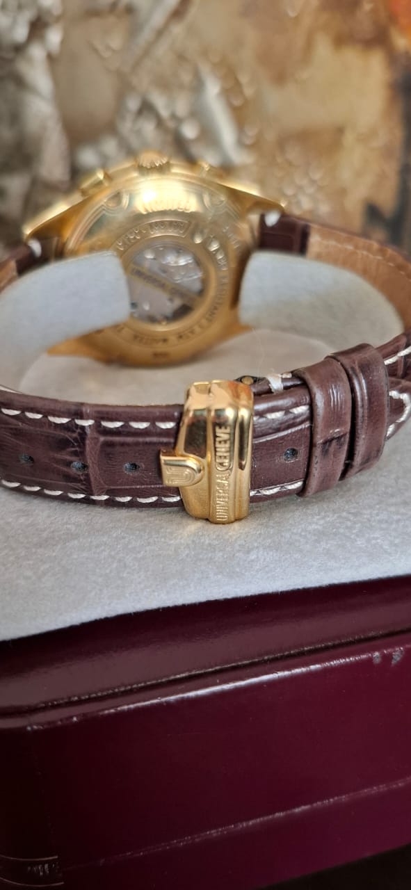 Chronograph "Master Tech" Rattrapante Limited Edition 200 Gold 18k/750. Часы были куплены для для души, одевались и носились очень редко только по праздникам. Произведены в 1995году. Идентификационный номер, референс: 188.100, Желтое золото 750 пробы, Калибр/Механизм: Cal: Manual UG 88 Split second Chronograph w 44hr. Power Reserve, 28.800 hr. Vibration hr. based on ETA Valjoux Cal. 7765. Редкое усложнение - трёхкнопочный сплит хронограф, и индикатор запаса хода( 44 часа) Застёжка выполнена из золота 750 пробы. Циферблат выполнен из серебра, стрелки и накладные метки выполнены из золота. Сапфировое стекло купол. Диаметр корпуса -39.5 мм. Вес часов с ремешком 113гр. Репассаж часов выполнен в 2020 году и после этого я их не носил, 1 раз в месяц заводил.