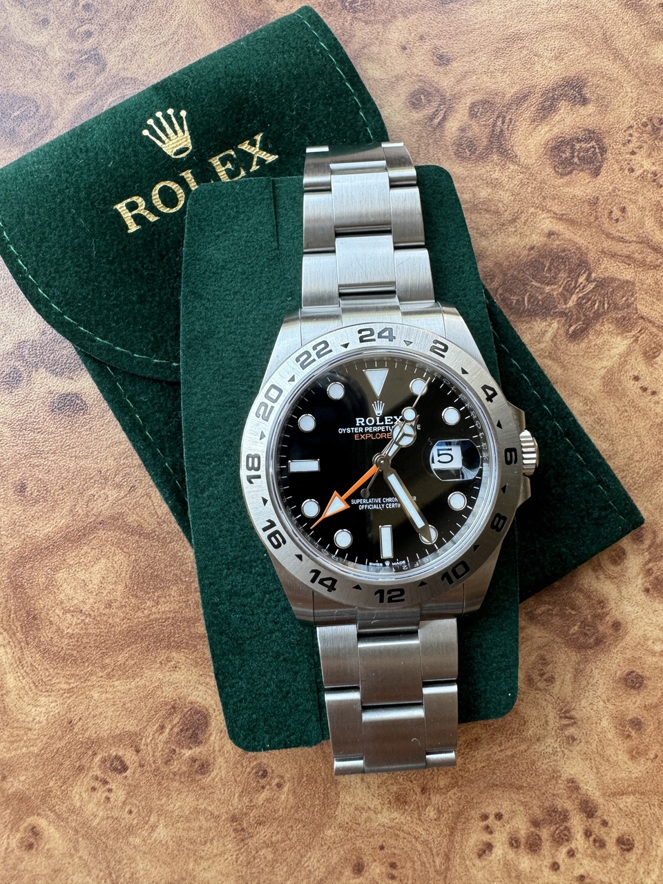 Продаю свои Rolex Explorer II 226570 с черным матовым циферблатом, выпущенные к 50-летию модели. На мой взгляд, это самый настоящий tool watch в текущей линейке. Новейший автоматический механизм с хронергическим спуском и запасом хода 70 часов, такой же как на последних Пепси и Бэтмене. Фирменный стальной безель с метками 24 часа, Oystersteel, брутальный сатинированный браслет с Easy Link. Носятся аккуртано, хорошо заходят под манжет рубашки, но рекомендовал бы на мощное запястье и в экстрим.