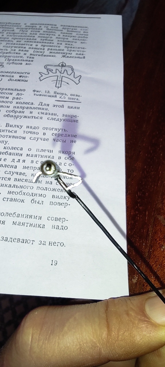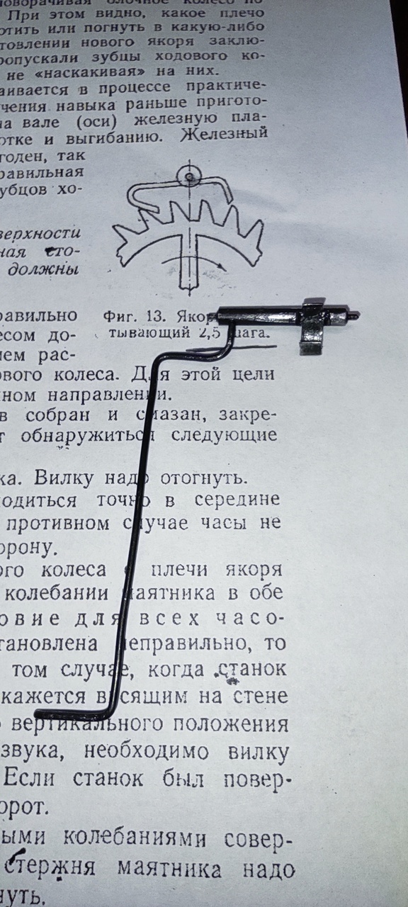 День добрый. Опять пришлось вернуться к этим часам. Часы ходили не уверенно и периодически останавливались. Подклинивал якорь о зубья анкерного колеса. Попробовал немного подогнуть плечи якоря. Итог - часы не идут. Причем останавливаются без "закусывания". Т.е. маятник продолжает свободно колебаться. Если маятник снять - часы идут бодро. Я новичок - не могу понять в чем причина. Не правильные углы у якоря и анкерное колесо не передает достаточный импульс для колебаний маятника? Подскажите что не правильно или как правильно решать такую проблему?
