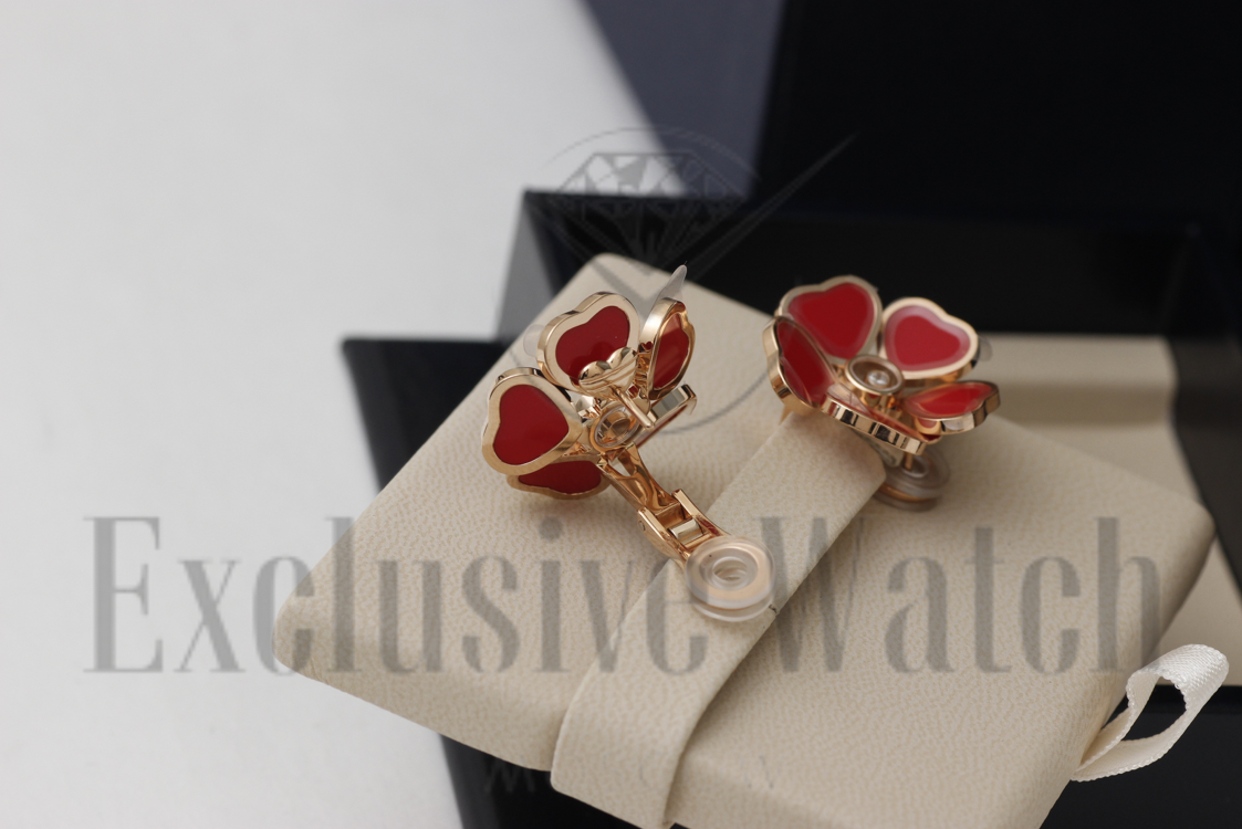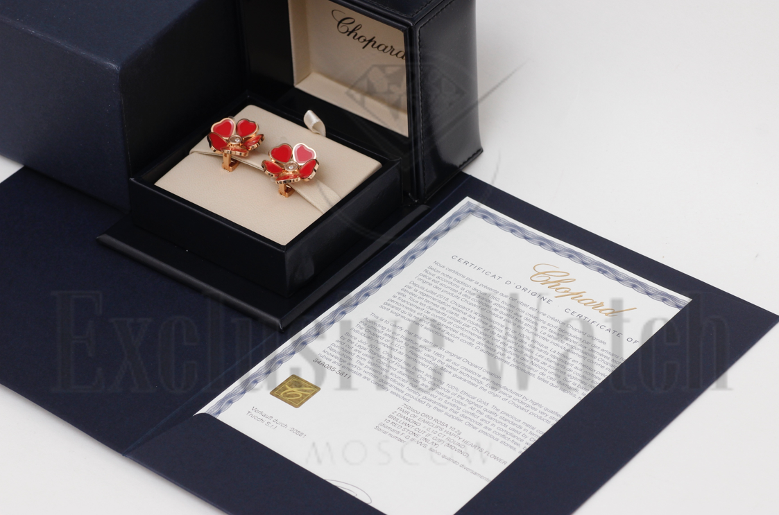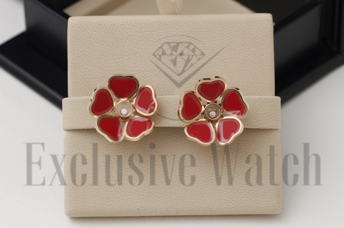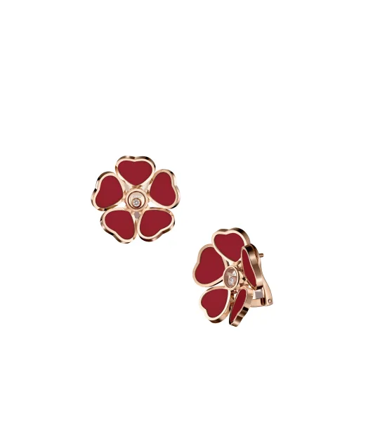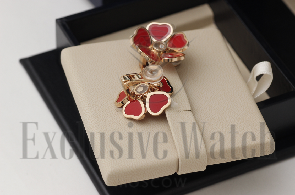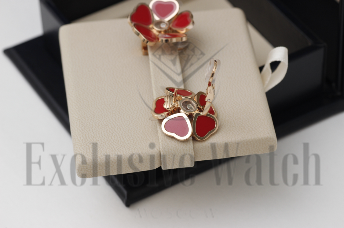 СЕРЬГИ *CHOPARD* HAPPY HEARTS FLOWERS 84A085-5811/РОЗОВОЕ ЗОЛОТО/ПЛАВАЮЩИЕ БРИЛЛИАНТЫ/КРАСНАЯ ЭМАЛЬ