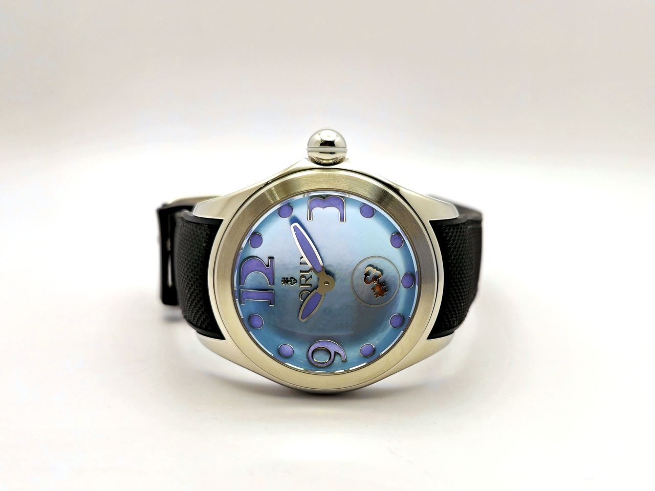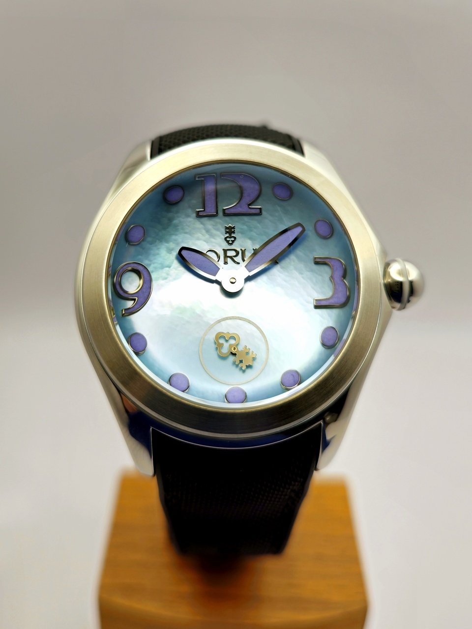 В продаже удобные и в то же время стильные часы как для мужчин так и женщин. Популярность классических решений в часовой индустрии обусловлена универсальностью линии Bubble от Corum, простотой и представительностью данного стиля. Часы произведены в стальном корпусе размером 42 мм. Толщина часов составляет 16,5 мм с выпуклым сапфировым стеклом. Швейцарский механизм от Frédéric Piguet на 30 камнях с автоматическим подзаводом работает от амплитуды движения руки и обеспечивает запас хода на 72 часа. Часы предназначены для того, чтобы в них спокойно плавали и имеют водонепроницаемость до 100 м. Ремешок, изготовленный из натурального каучука с простой застёжкой из стали, очень удобен в носке и выполнен с перфорацией. Завершает образ необыкновенный голубой перламутровый циферблат и светло-сиреневого цвета люм на стрелках, метках, которые дополняют образ модели.
