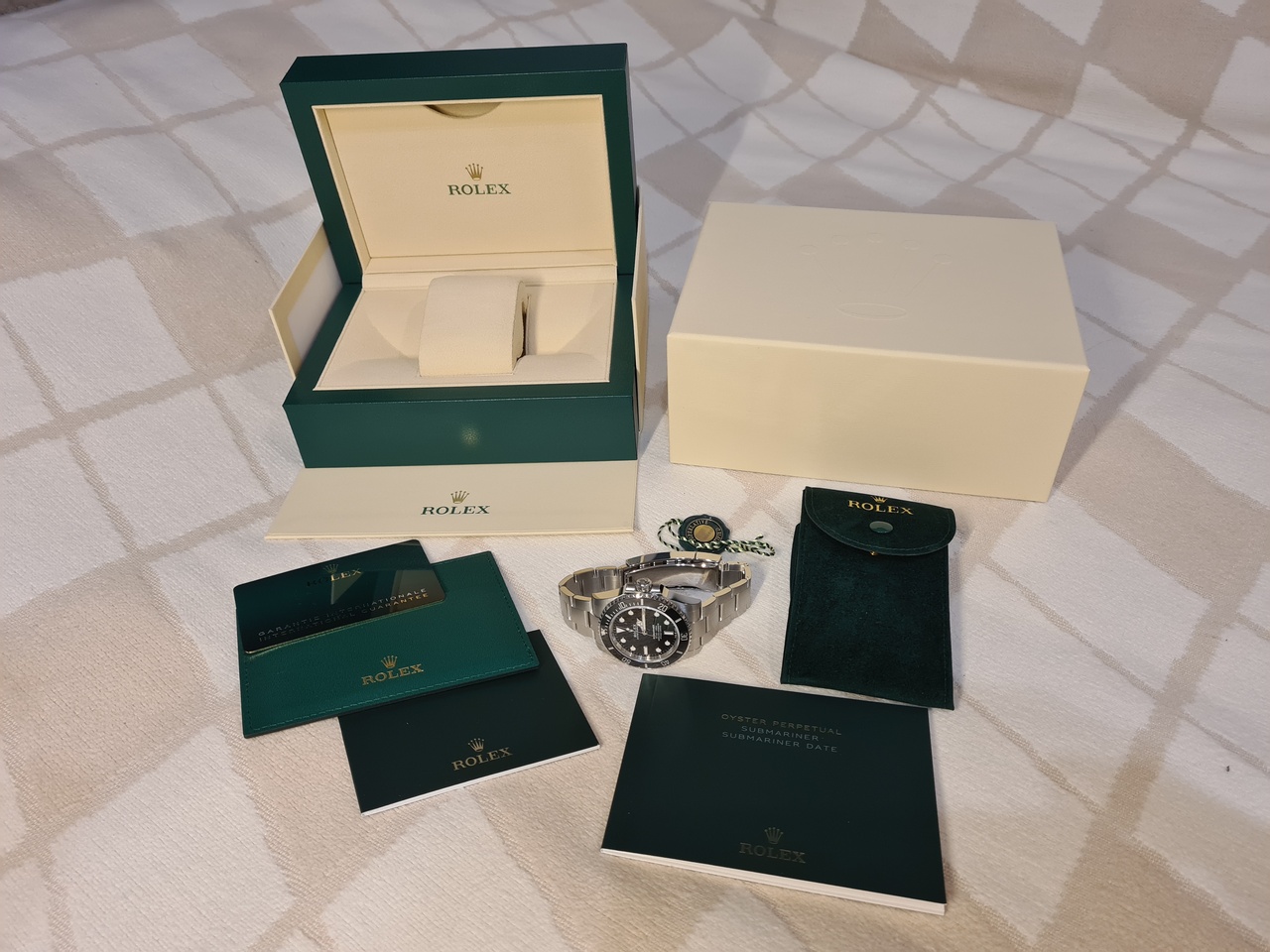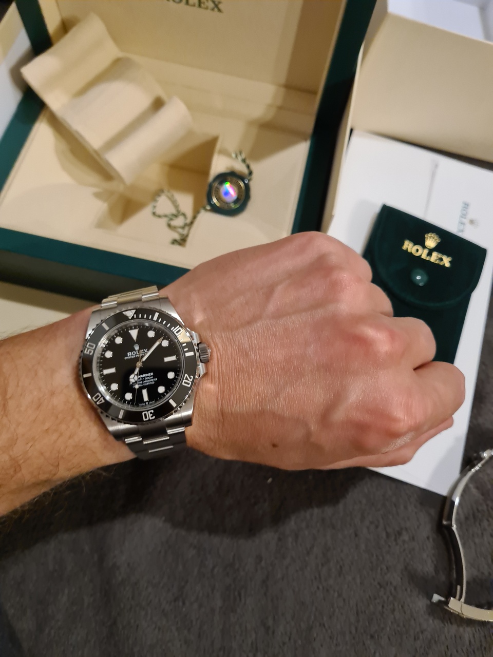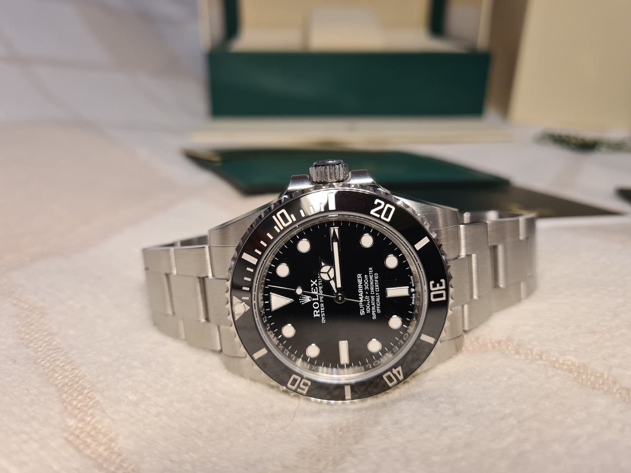 выставляю на продажу свои часы Rolex Submariner (No Date) ref. 124060, которые купил в сентябре 2024 года в бутике Rolex и надевал на руку лишь только в момент покупки и уже дома в качестве пробы, чтобы попытаться сначала привыкнуть к ним. Когда покупал эти часы, предполагал, что перейду на них со своих Datejust, которые ношу уже несколько лет, практически не снимая и уже не ощущая их на руке, но к сожалению, так и не получилось мне привыкнуть к новым часам. К тому же считаю, что часы должны носиться, а не лежать в коробке.
