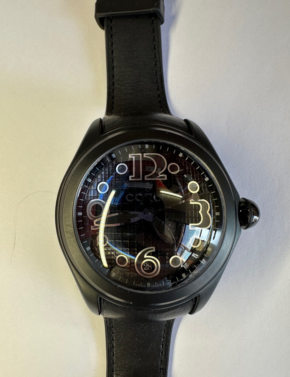 Corum Bubble Heritage Black Limited Edition, экземпляр в первой десятке из 350 выпущенных. Ремешок - кожа с каучуковой подкладкой в отличном состоянии, часы носились очень мало и бережно. Хороши как в коллекцию, так и для повседневной носки. Несмотря на свои 47мм отлично сидят даже на моей совсем некрупной руке. Не ремонтировались, не разбирались, ход прекрасный. Полный комплект - две коробки, все документы, гарантийный талон.