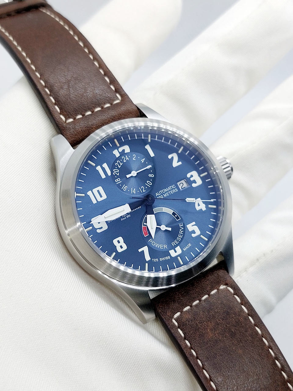Циферблат синего цвета с эффектом Sunray имеет несколько уровней, а так же два дополнительных циферблата показывающие 24-х часовой формат(GMT) и индикатор запаса хода.