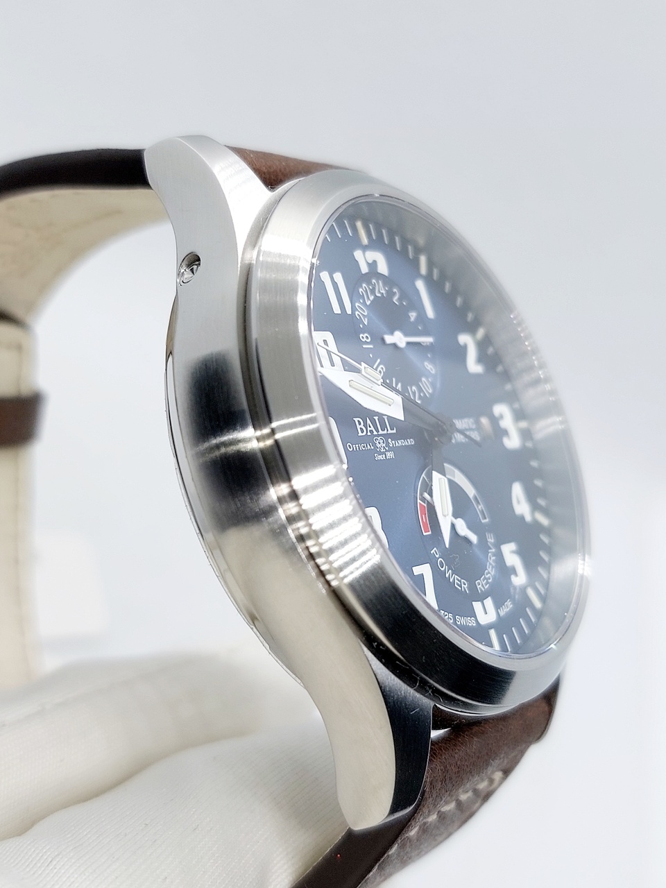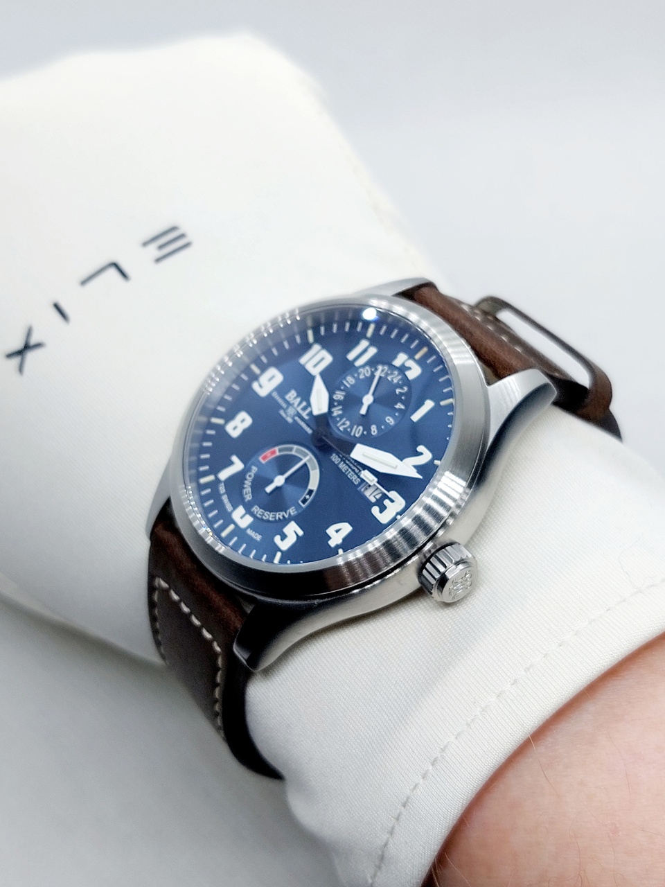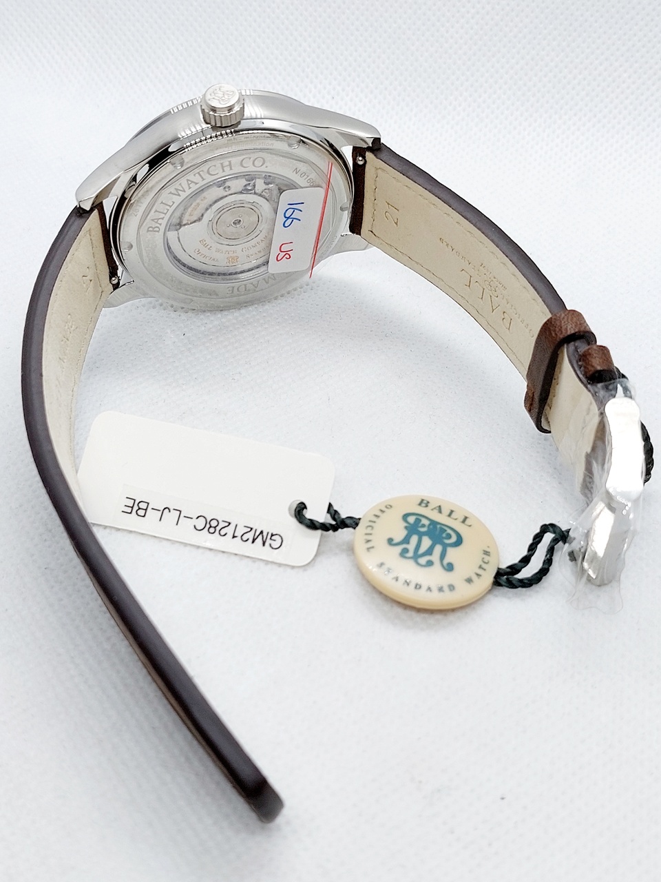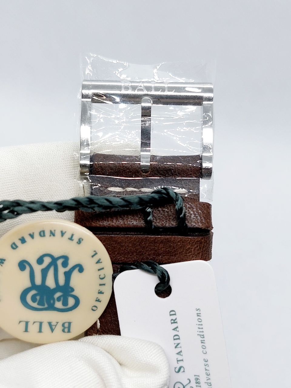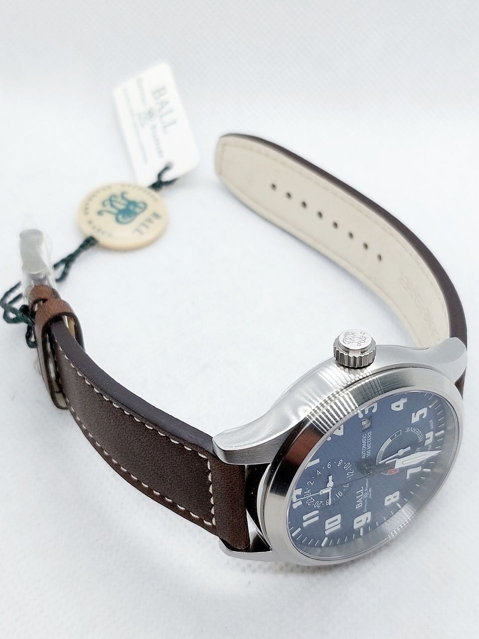 Ball оснащены кожаным ремешком из телячьей кожи коричневого цвета с белой прострочкой и классической застёжкой на которой нанесен логотип бренда.