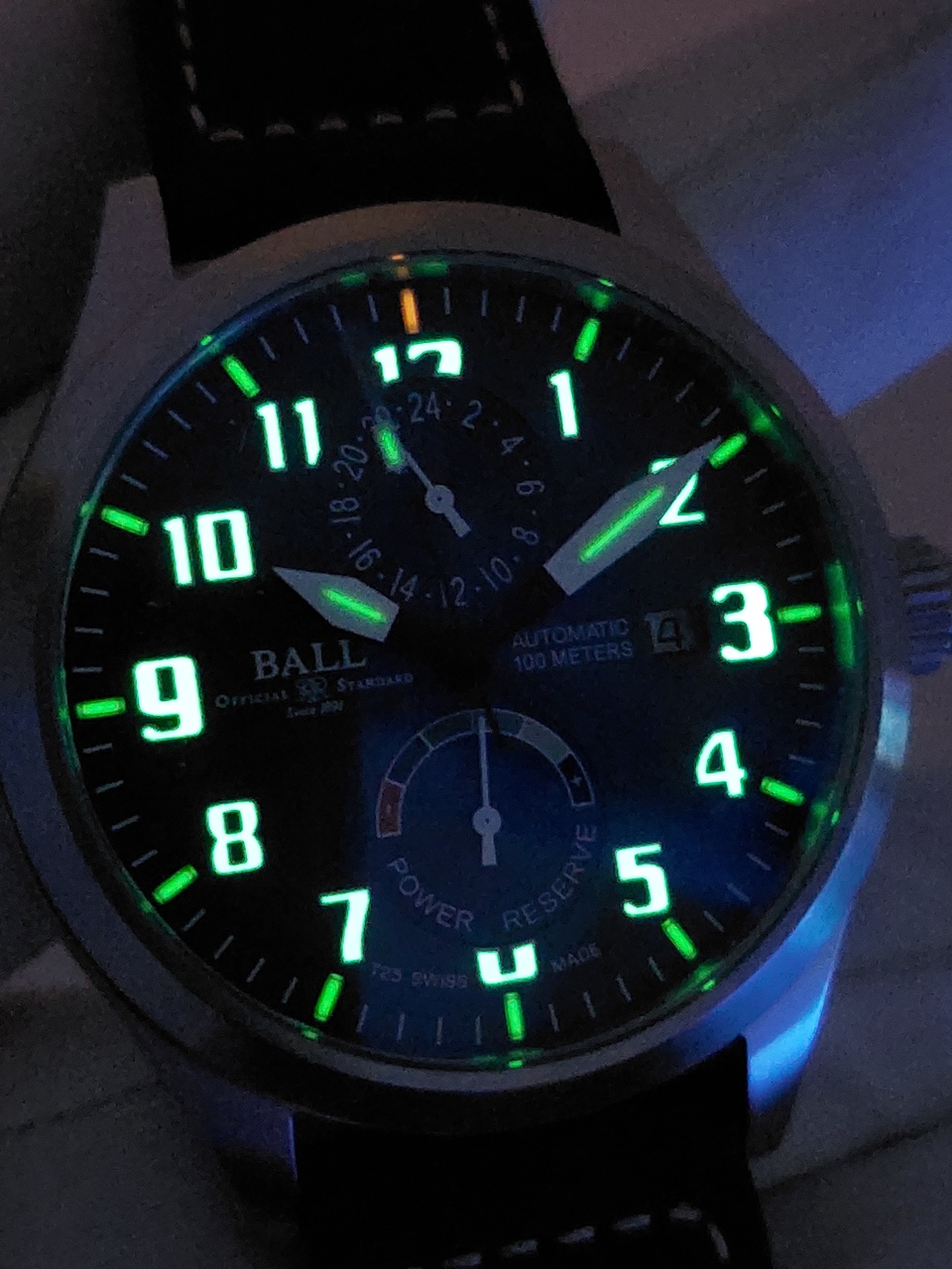 Все стрелки покрыты Super-lumiNova и на каждой установлена микротрубочка с тритием ярко-зеленого цвета, для лучшей читаемости в темноте.