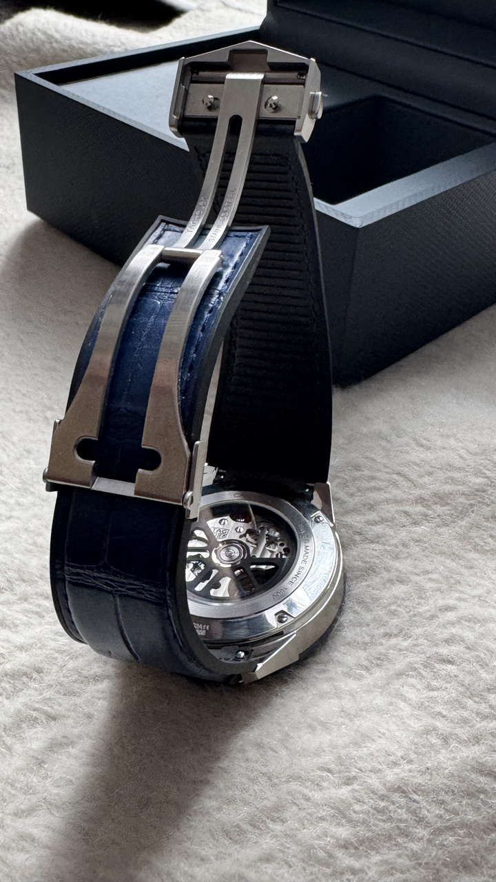 Ремешок: синий ремешок из кожи аллигатора с подкладкой из черного каучука.