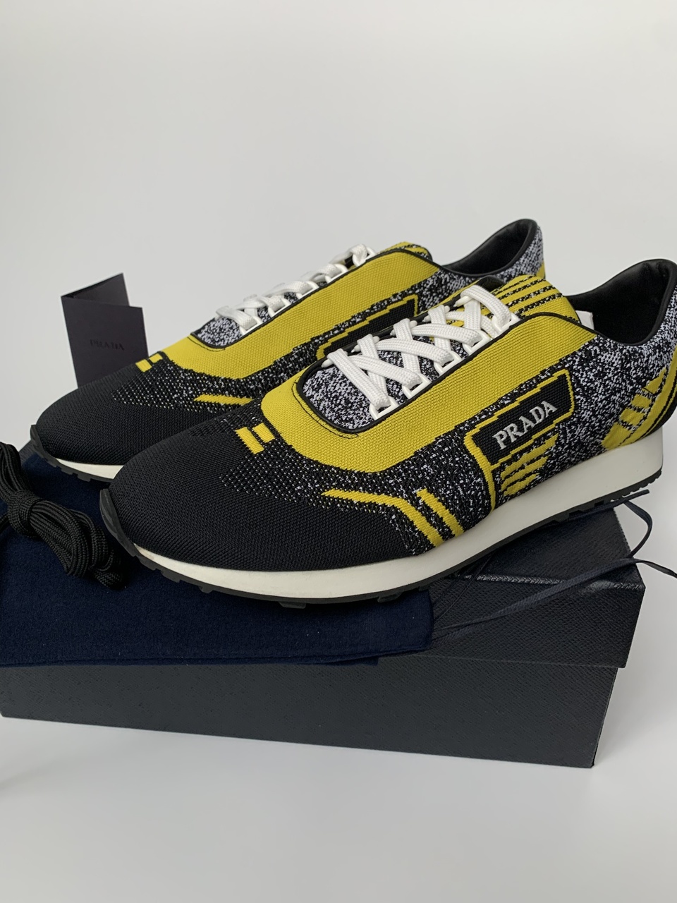 При создании мужских коллекций дизайнеры PRADA фокусируются на моделях,которые никогда не выходят из моды,но при этом всегда остаются актуальными и вписываются в любой гардероб.Данная обувь-не исключение.Это сочетание технологичных материалов,мастерского пошива и богатой цветовой палитры.Яркий пример-в равной степени элегантные и комфортные кроссовки на шнуровке чёрного,серого и жёлтого цвета.Они имеют закруглённый носок,шнуровку спереди,логотип снаружи,стиль колор-блок,стельку с логотипом и плоскую резиновую подошву.