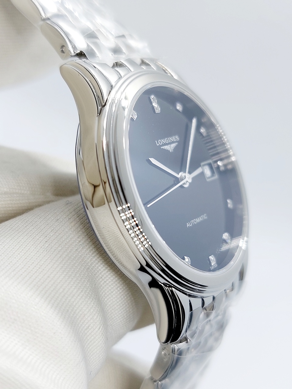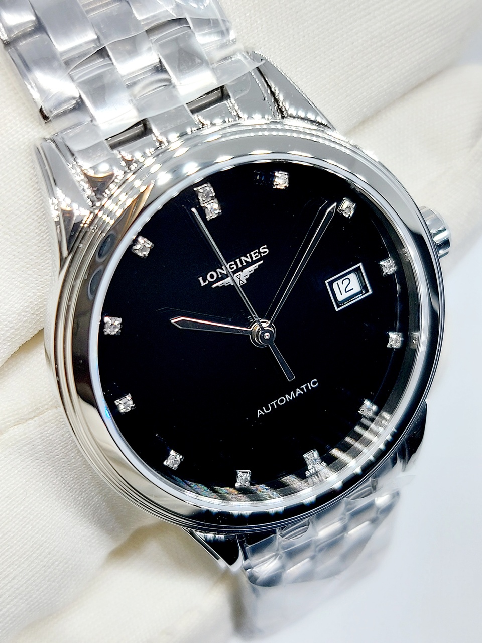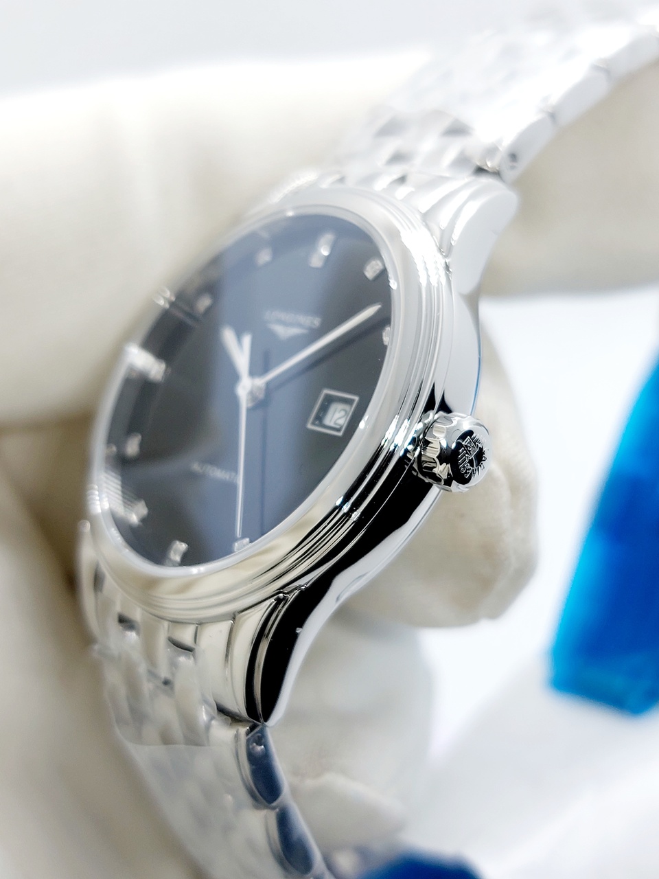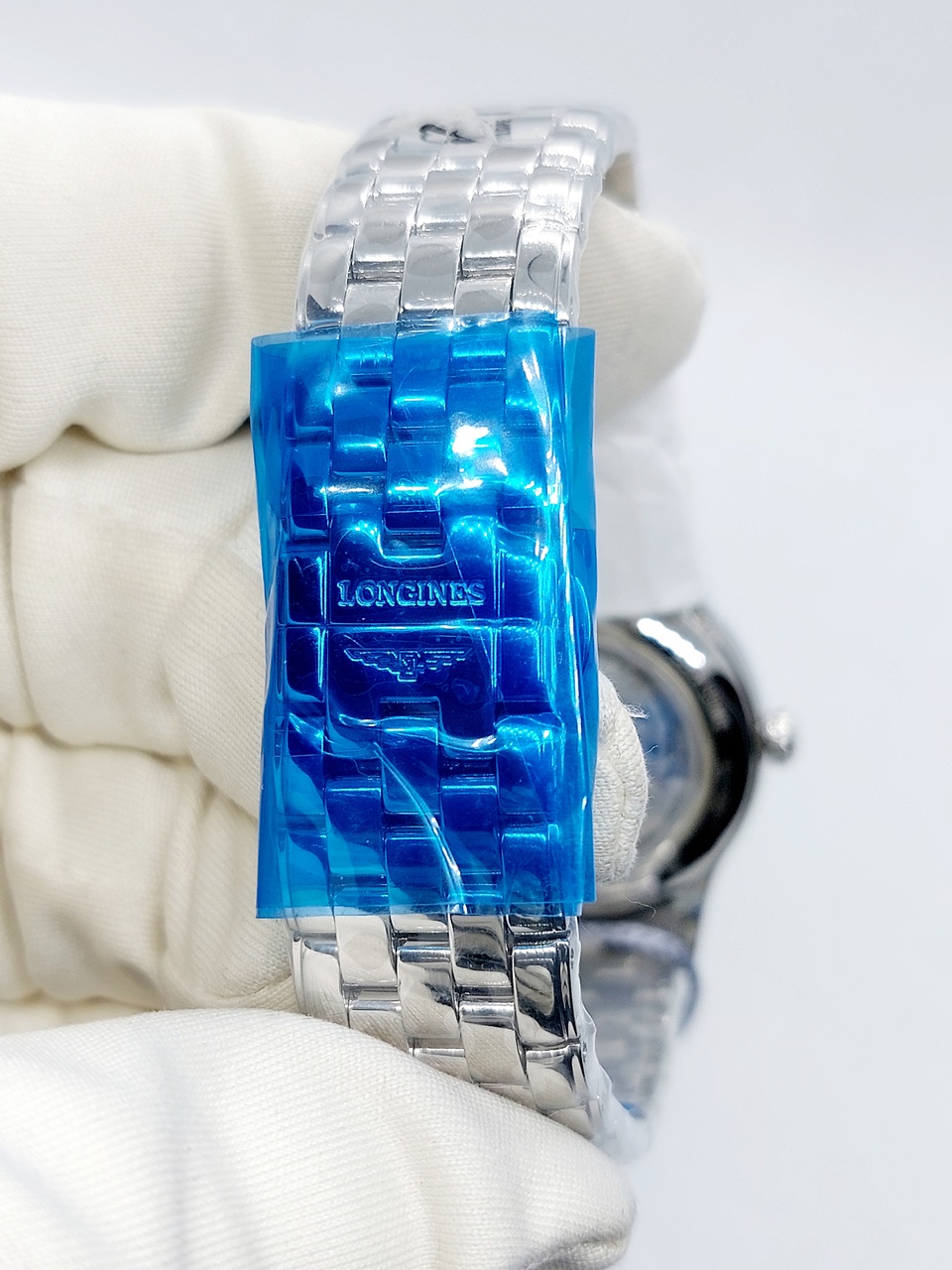 Под отметкой 12-ти часов напечатано название Longines белым и логотип бренда серебристым цветами.
