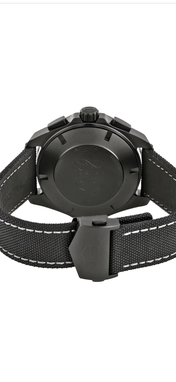 Часы TAG Heuer Aquaracer Black Phantom не зря получили такое название - вся отделка часов выполнена в монохромной черно-серой гамме. При этом показания часов отлично читаются благодаря апллицированным часовым меткам с покрытием "черное золото" и ювелирной огранкой. Также индикаторы и стрелки покрыты светящимся в темноте люминофором Super-LumiNova®. Как и все модели серии Aquaracer, данный хронограф имеет высокий показатель водостойкости - 300 метров. Резьбовое соединение задней крышки и винтовая фиксация переводной коронки обеспечивают водонепроницаемость модели.