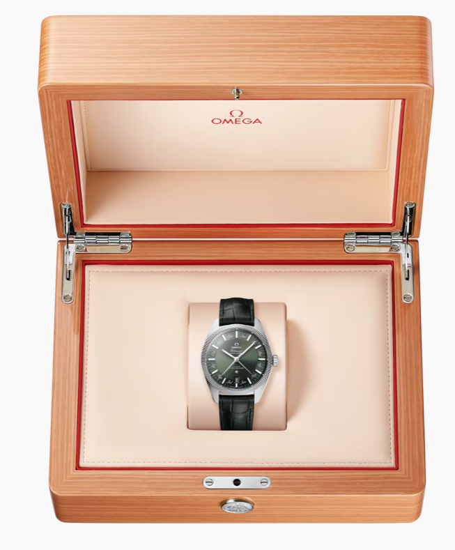 Материал ремешка/браслета: темно-зеленый из кожи аллигатора, ширина 20 мм. Браслетная застежка с гравированной эмблемой Omega