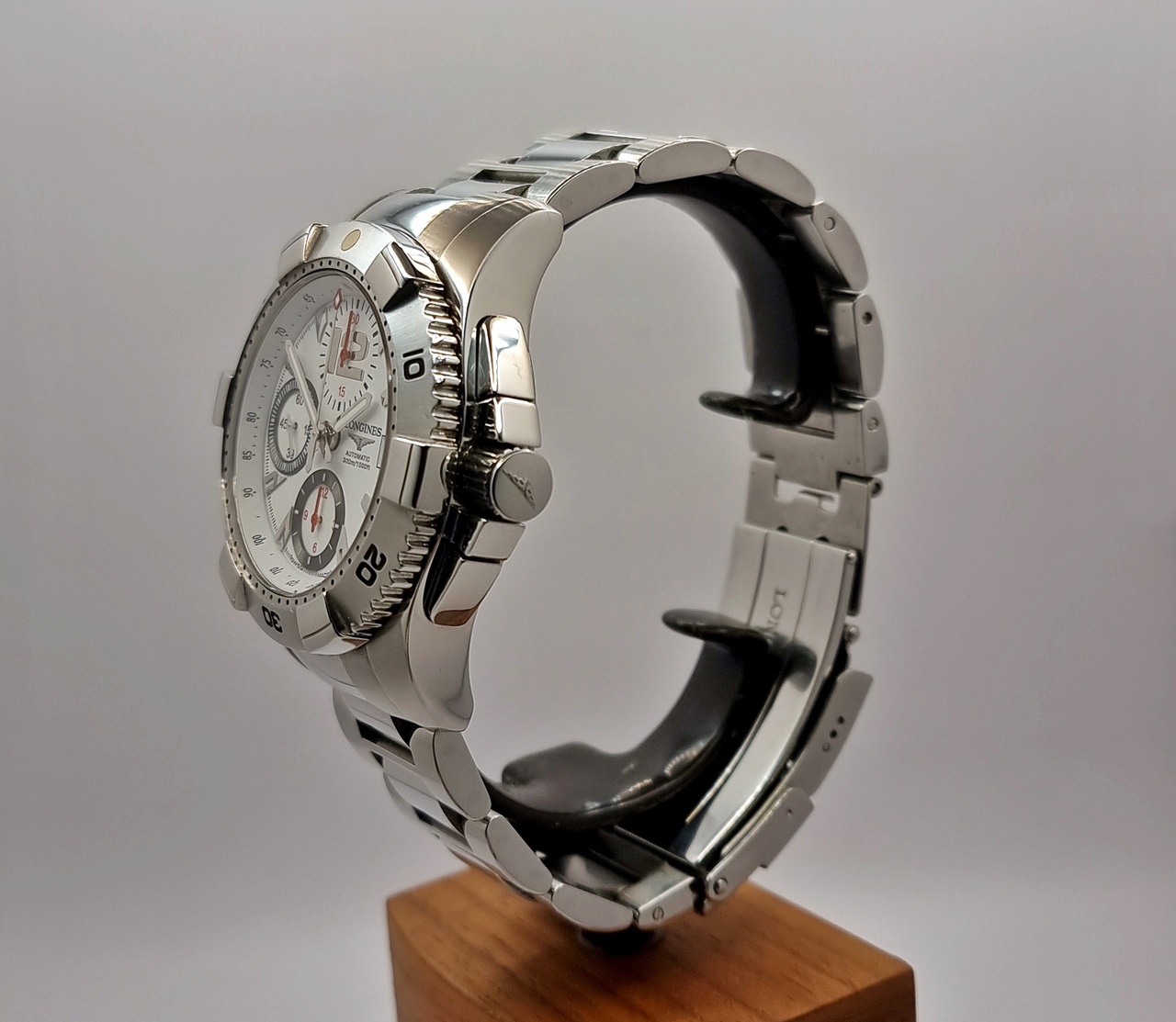 В продаже легендарные мужские часы хронограф от Longines в размере корпуса 41,0 мм. Корпус выполнен из нержавеющей стали 316L. Безель вращающийся. Завинчивающаяся заводная головка. Сделаны в Швейцарии.