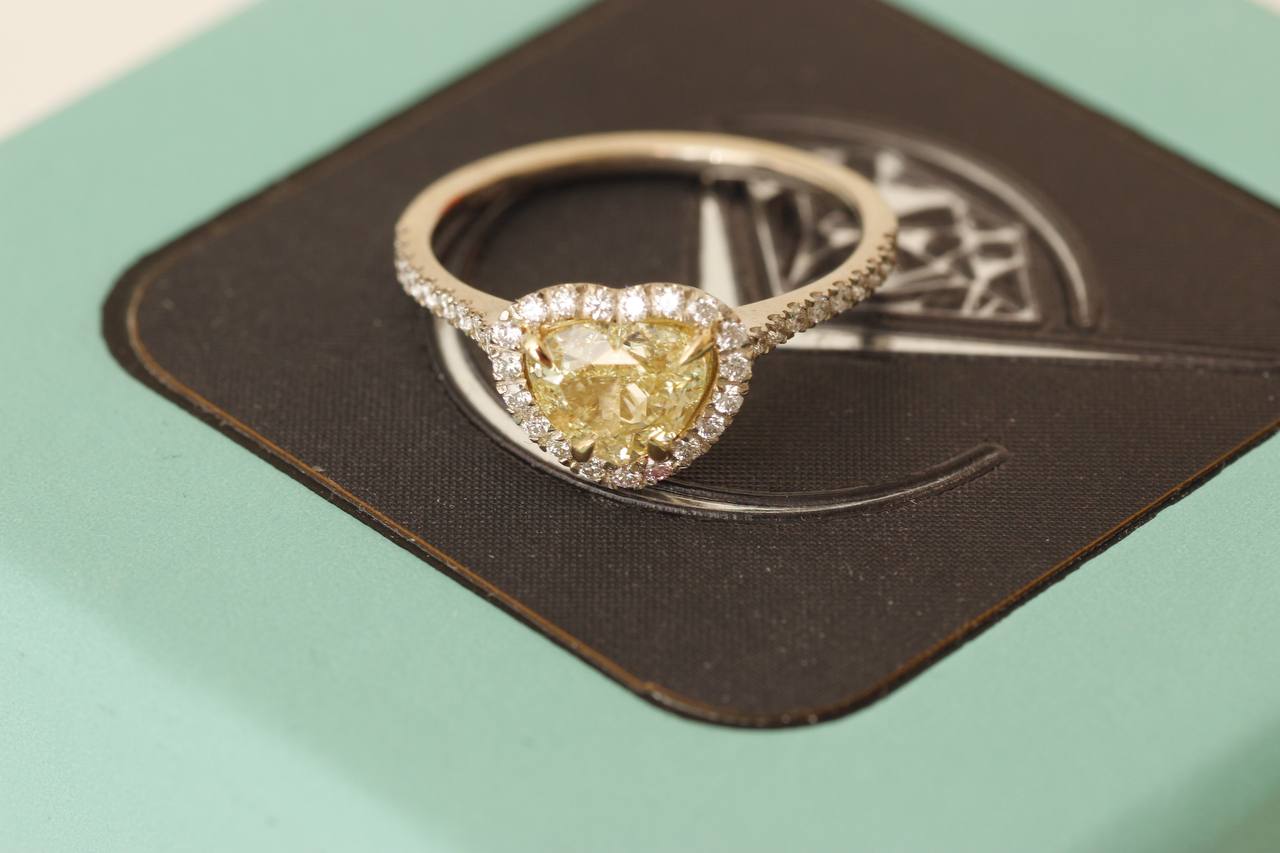 КОЛЬЦО С ТОПОВЫМ ЖЕЛТЫМ БРИЛЛИАНТОМ 1.05 КАРАТ ОГРАНКИ СЕРДЦЕ FANCY LIGHT YELLOW/VVS2 (EX/EX) В БЕЛОМ ЗОЛОТЕ 18К/СЕРТИФИКАТ GIA