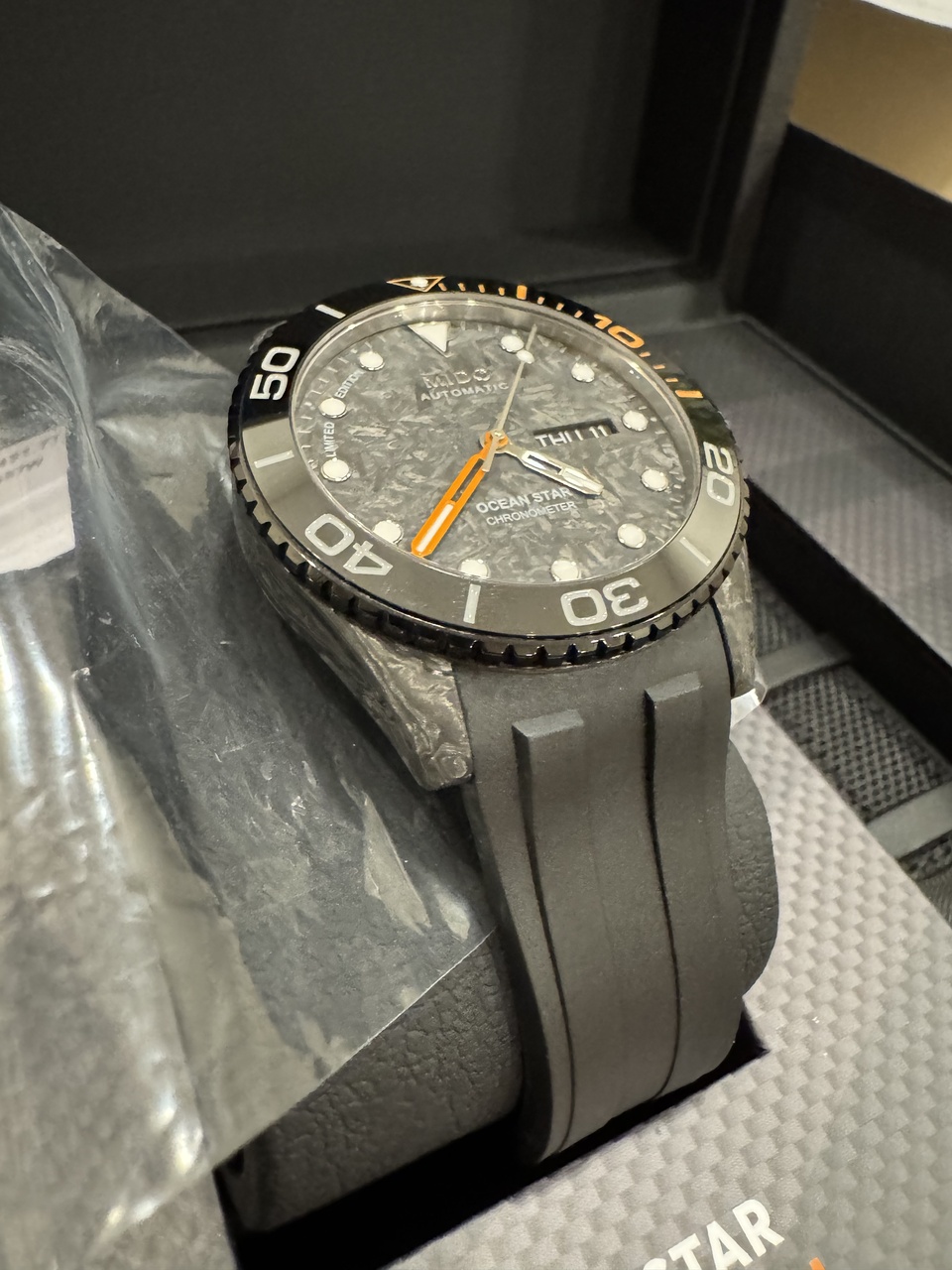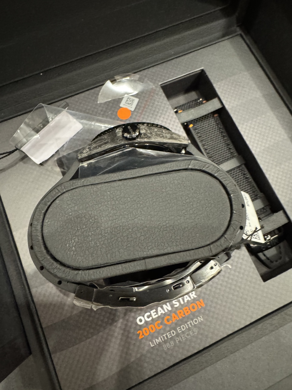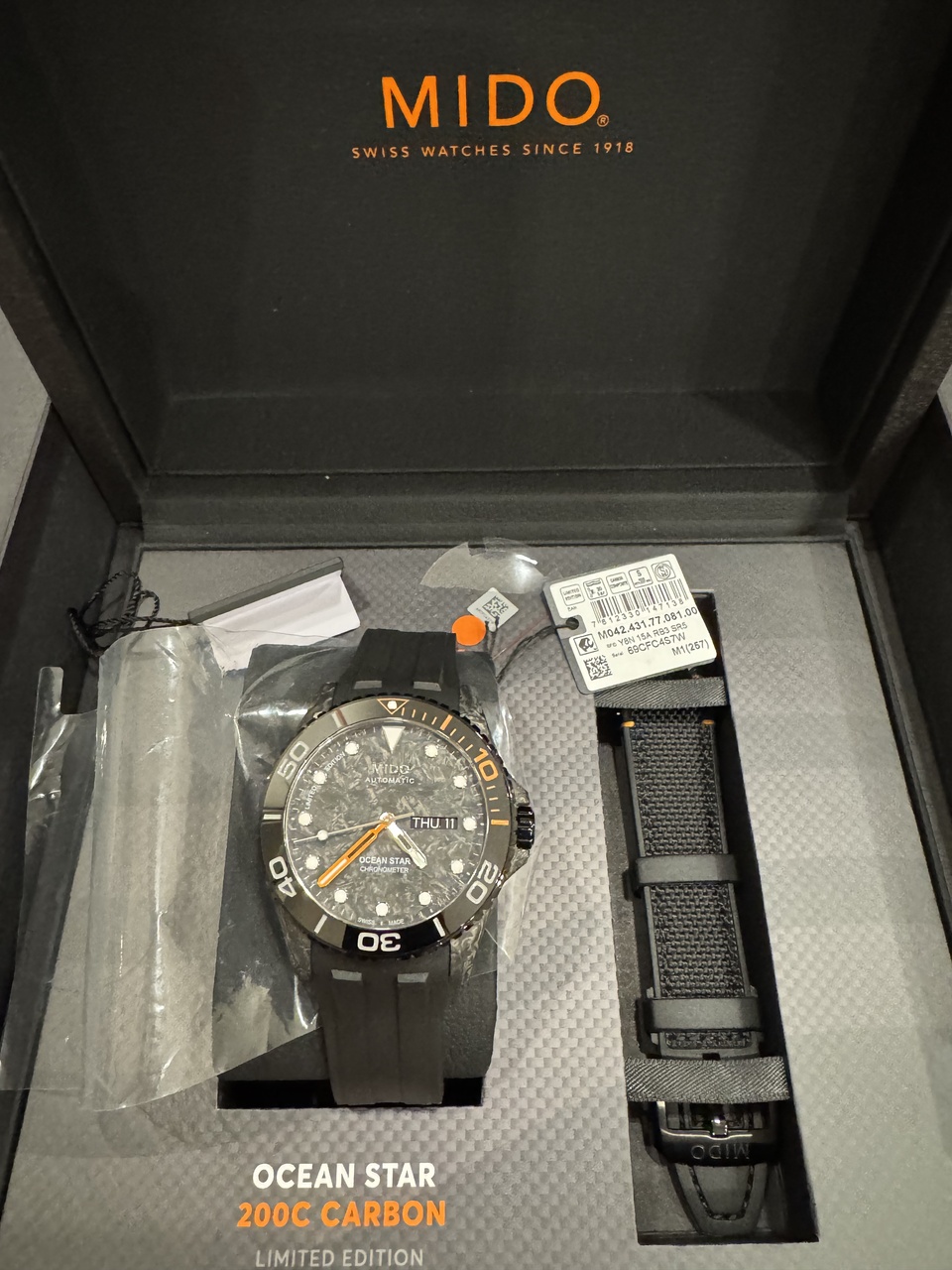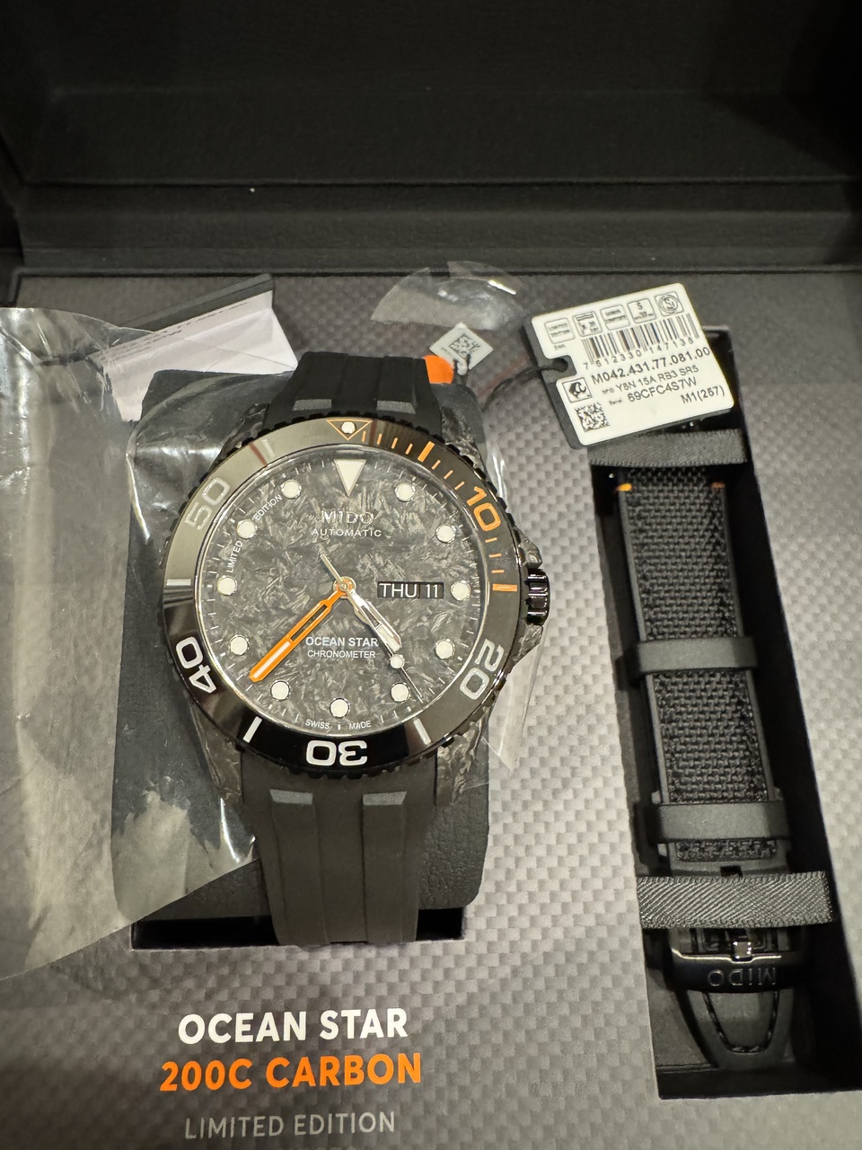 Редкая новинка 2024 года Ocean Star 200C Carbon Limited Edition от компании Mido. Это первая модель бренда, оснащенная корпусом и циферблатом из композитного углеродного волокна.
