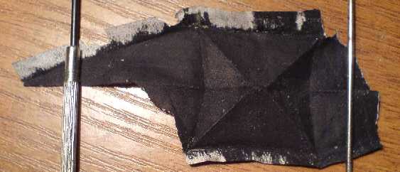 Новый мех изготавливается из заготовки "зонтичной" ткани негодного зонта прямоугольной формы размерами 180*40 мм. Заготовка вырезается четко вдоль и поперек нитей плетения.