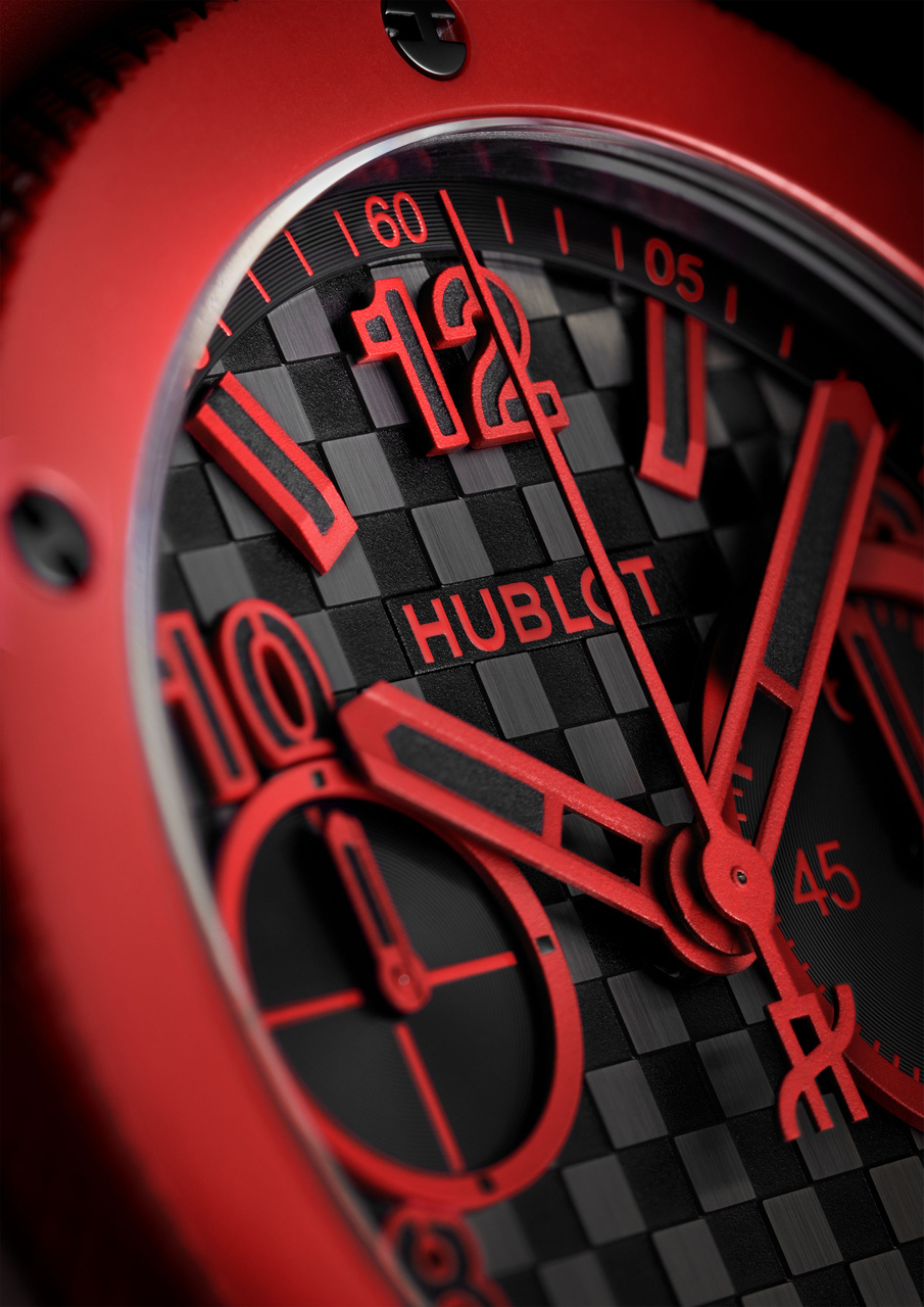 Сочетание ярко-красной керамики и циферблата с узором, напоминающим переплетение нитей углеводородного волокна, настолько же экспрессивно, насколько смело и индивидуально.