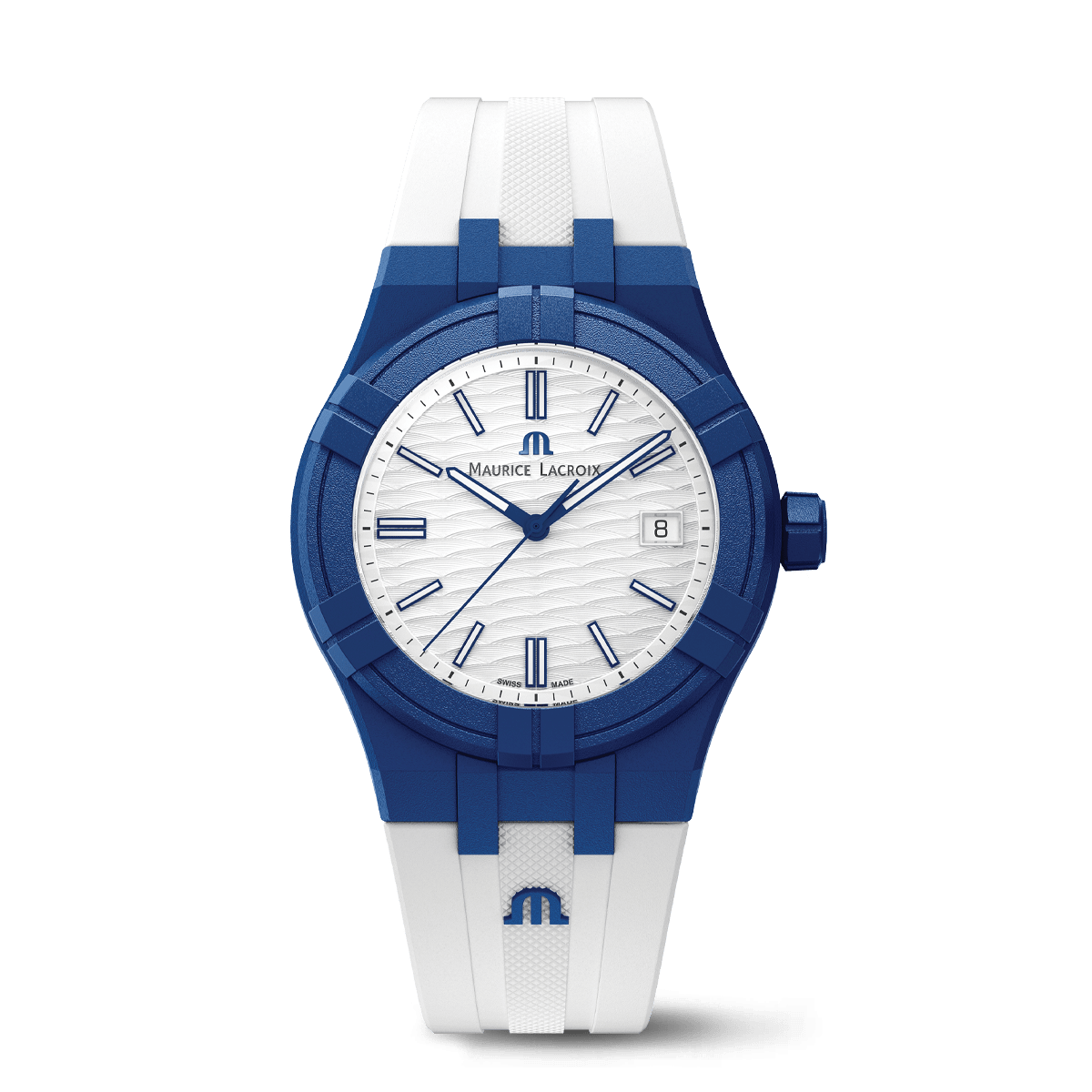 MAURICE LACROIX AIKON #TIDE AI2008-BBB11-300-0 ... ∅ 40 ... WR 100 ... БЕЛЫЙ ЦИФЕРБЛАТ С УЗОРОМ "Vagues du Jura"... СИНИЙ КОРПУС И ЗАСТЕЖКА РЕМНЯ ... БЕЛЫЙ КАУЧУК ☆ РОЗНИЦА 97,000 ₽ ☆ - 45 % ☆