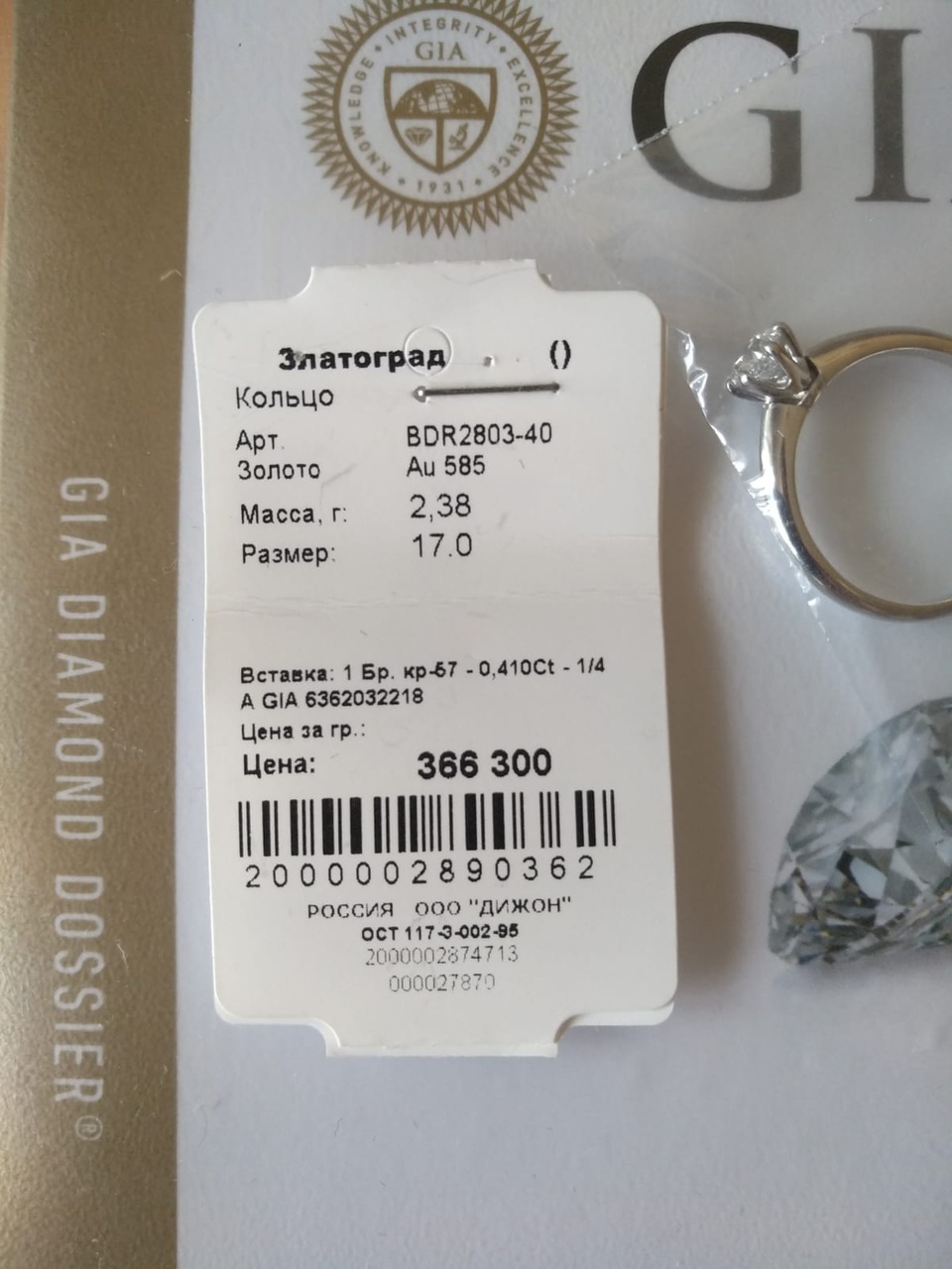 Кольцо La vivion с бриллиантом 0,41 D/VS1. Сертификат GIA.
