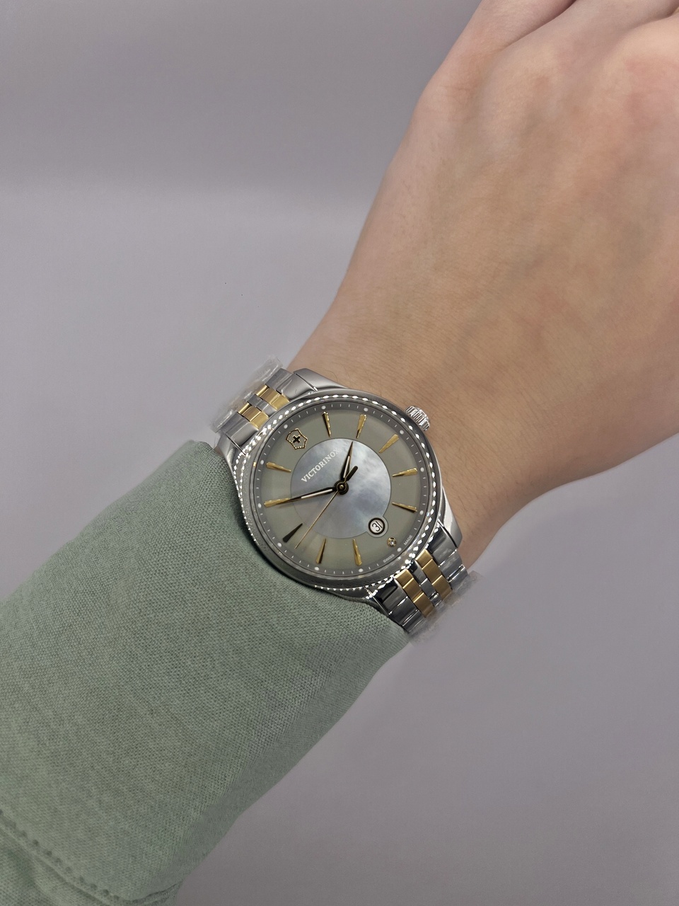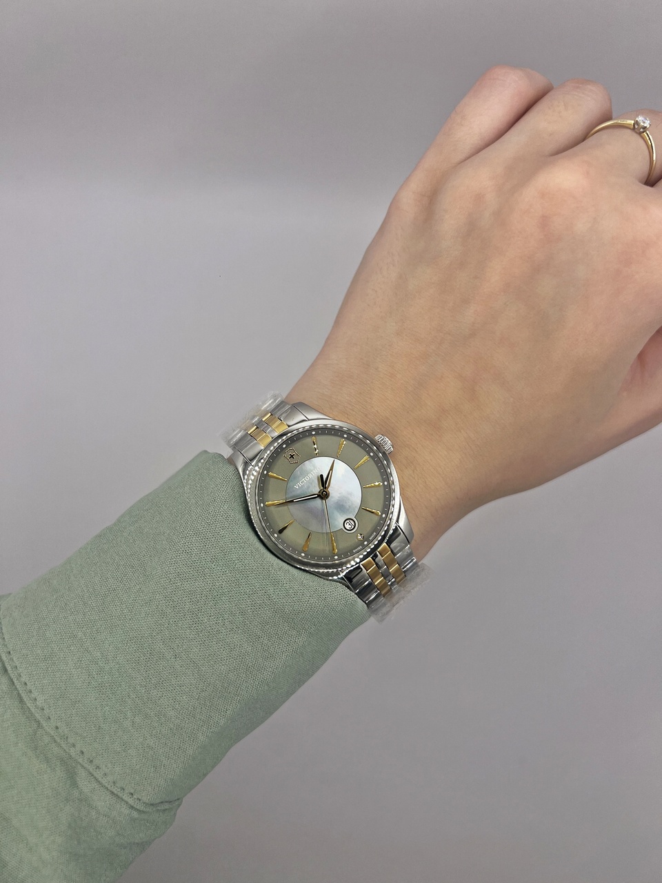 Лаконичный блеск стали дополняют туманные блики перламутрового циферблата, превращая этот элегантный аксессуар в эталон женского стиля. Сапфировое стекло с тройным антибликовым покрытием. Завинчивающаяся задняя крышка корпуса. Циферблат инкрустирован бриллиантом (0,0045 карат TW/SI), на 6 часов, ниже апертуры даты. Браслет оснащен раскладывающейся застежкой с кнопками.