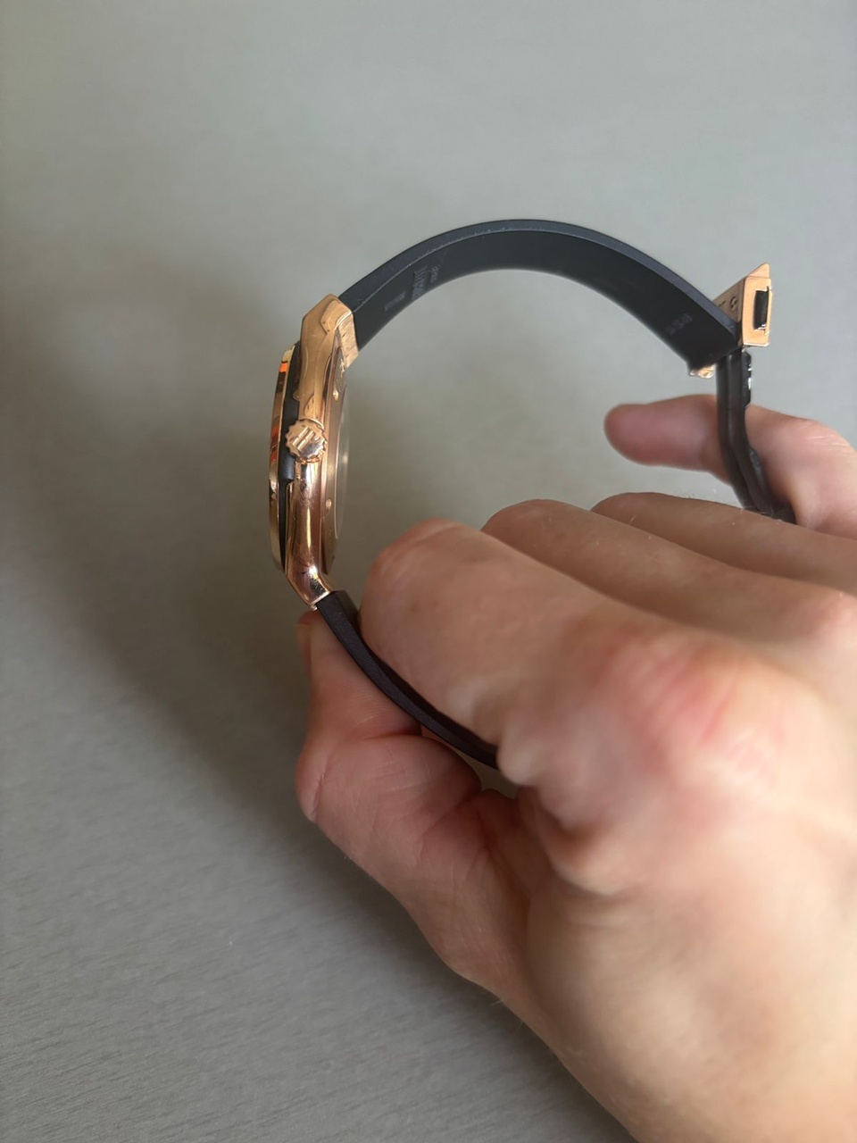 Ремешок из чёрного каучука и кожи аллигатора с вставкой из розового золота подчёркивает гибридный дизайн, а 50-метровая водонепроницаемость добавляет практичности.