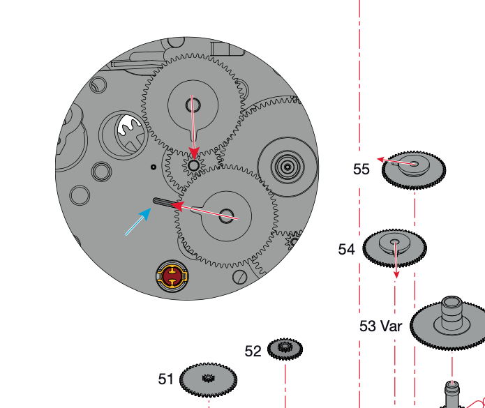 Готовлюсь собирать календарь в ЕТА 7750, возник вопрос, как правильно должны быть выставлены колеса перевода даты и дня недели относительно метки на мосту и друг друга. Гугление дало статью в которой утверждается что: