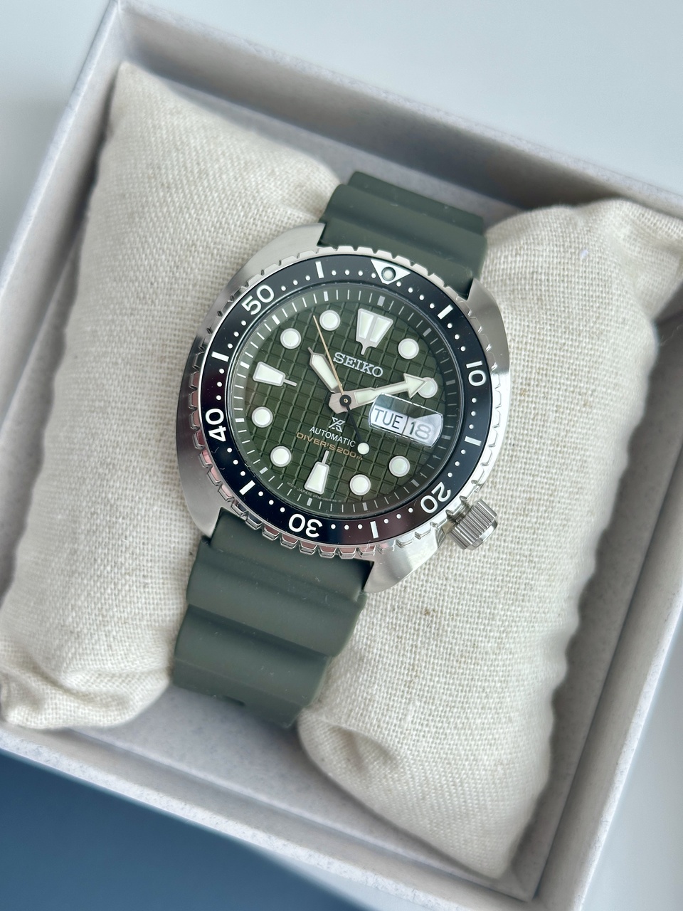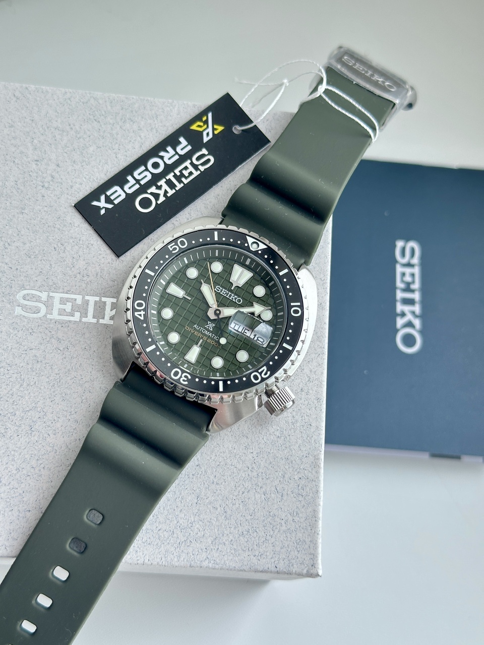 ЗЕЛЁНЫЕ SEIKO PROSPEX KING TURTLE SRPE05K1, КЕРАМИКА, САПФИР, МЯГКИЙ РЕМЕШОК, ШИКАРНЫЙ ЦИФЕРБЛАТ В СТИЛЕ ПЛИТКИ.