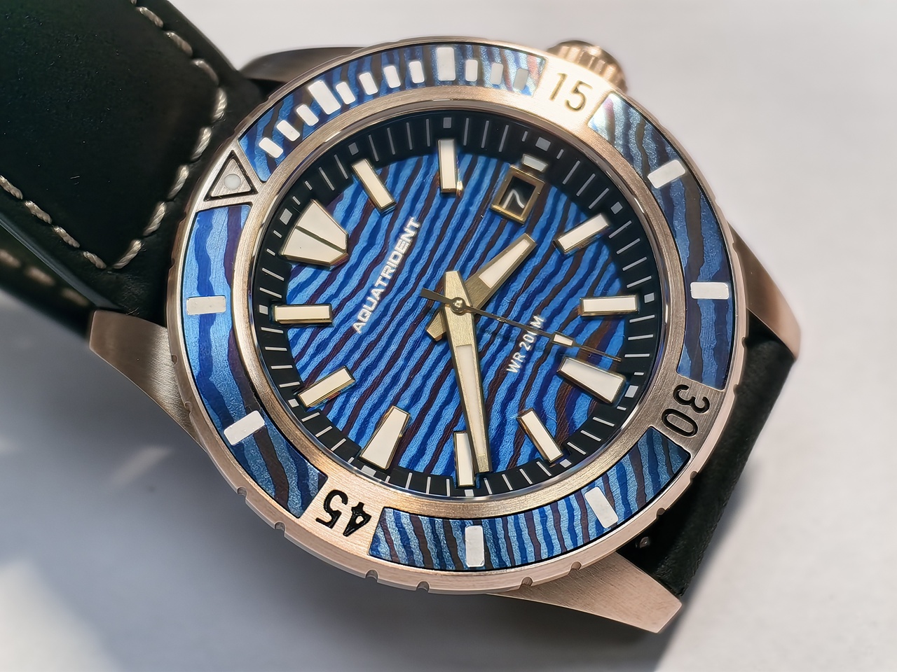 По периметру крышки выгравированы надписи: Aquatrident, By Timeculture,W.R.20 ATM, Automatic, AQ-23007, Sapphire, Bronze, Ti Damascus.