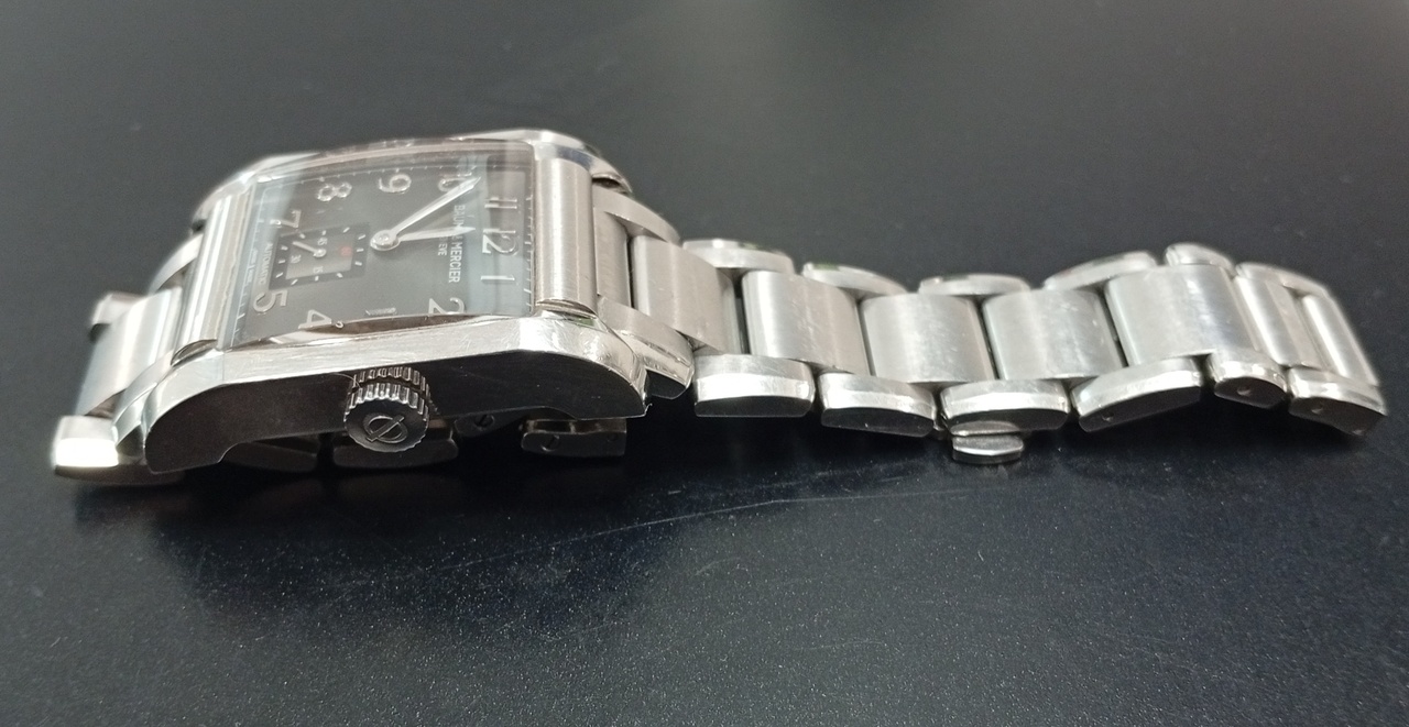 Продаю свои часы, так как в связи со сменой работы, отпала необходимость в деловых часах. Есть как естественные потертости, так и одна более заметная. Так же есть незаметный для глаза, но ощущаемый ногтем скол на грани стекла. Все видно на фото. Браслет уменьшен, снятые звенья прилагаются. Не обслуживались, ход отличный - отстают на 5-6 секунд в сутки. Автоподзавод; быстрого перевода даты нет.