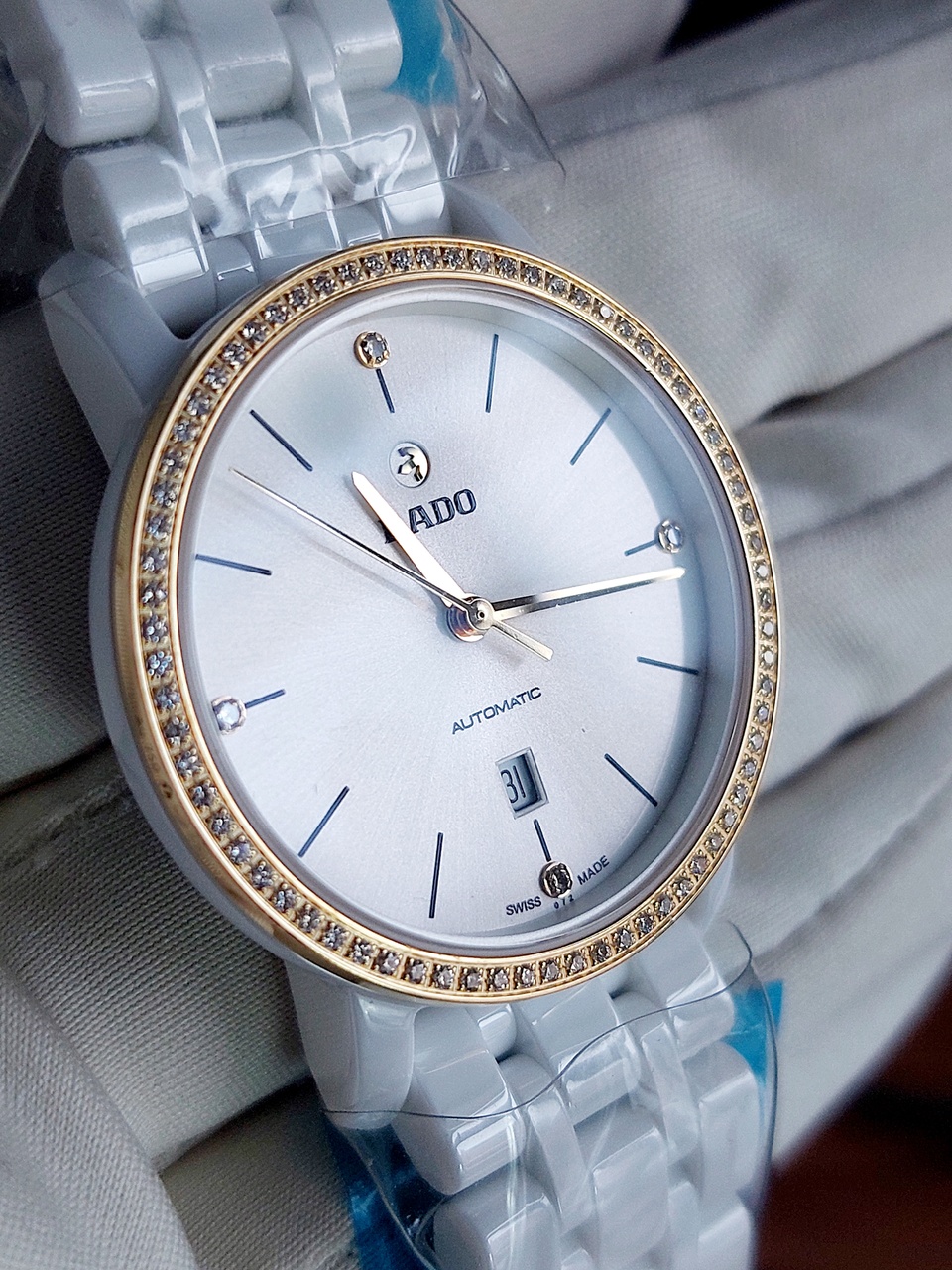 Корпус часов круглой формы, диаметром 33 мм изготовлен из высокотехнологичной керамики белого цвета.