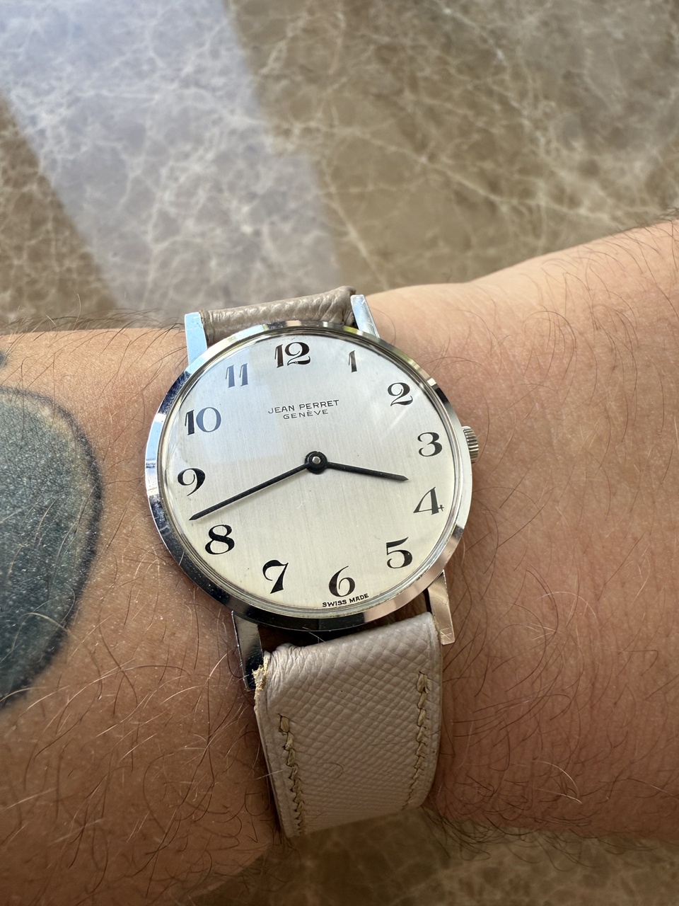 Очень красивая модель часов небольшой швейцарской мануфактуры Jean Perret Geneve. Диаметр 35 мм, но за счет отсутствия безеля смотрятся на крупной руке очень элегантно. На фото часы на моем запястье 21 см. В комплекте красивый заказной ремешок большой длины. Часы очень тонкие. На задней стороне есть следы времени, а на лицевой стороне просто идеальный вид. Отдельно заслуживает внимания перламутровый линованный циферблат, переливающийся под разным углом обзора. Механика с ручным заводом.