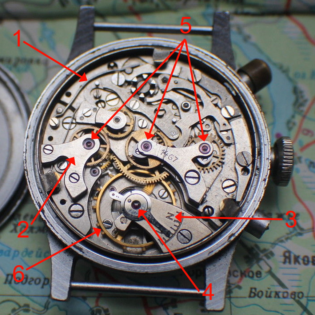 Механизмы с ранней нумерацией (6 знаков): (1) клейма на мосту нет, (2) даты выпуска нет, (3) градусник немецкий, (4) накладной камень белый, (5) камни хронографа в бушонах, (6) баланс белый.