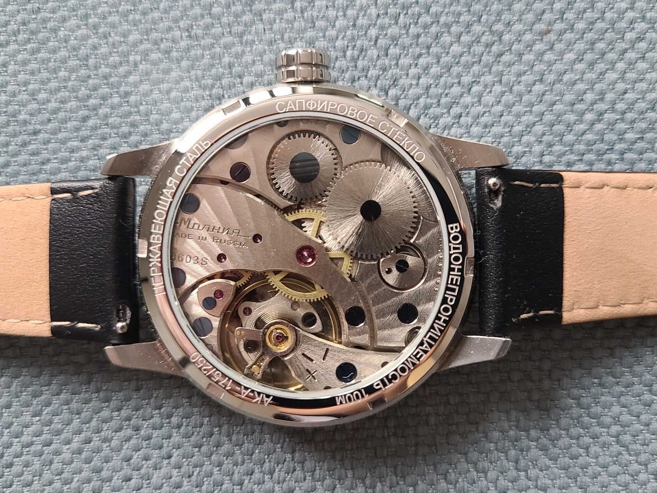 Задняя крышка прозрачная, внутри механизм Молния 3603S. Механизм декорированный, с синеными винтами, с фасками на мостах и с женевской волной. Всю картину портят заводное и барабанное колеса, декорированные грубым радиальным сатинированием, и с достаточно грубой обработкой зубьев. Тут, безусловно, есть куда стремиться.