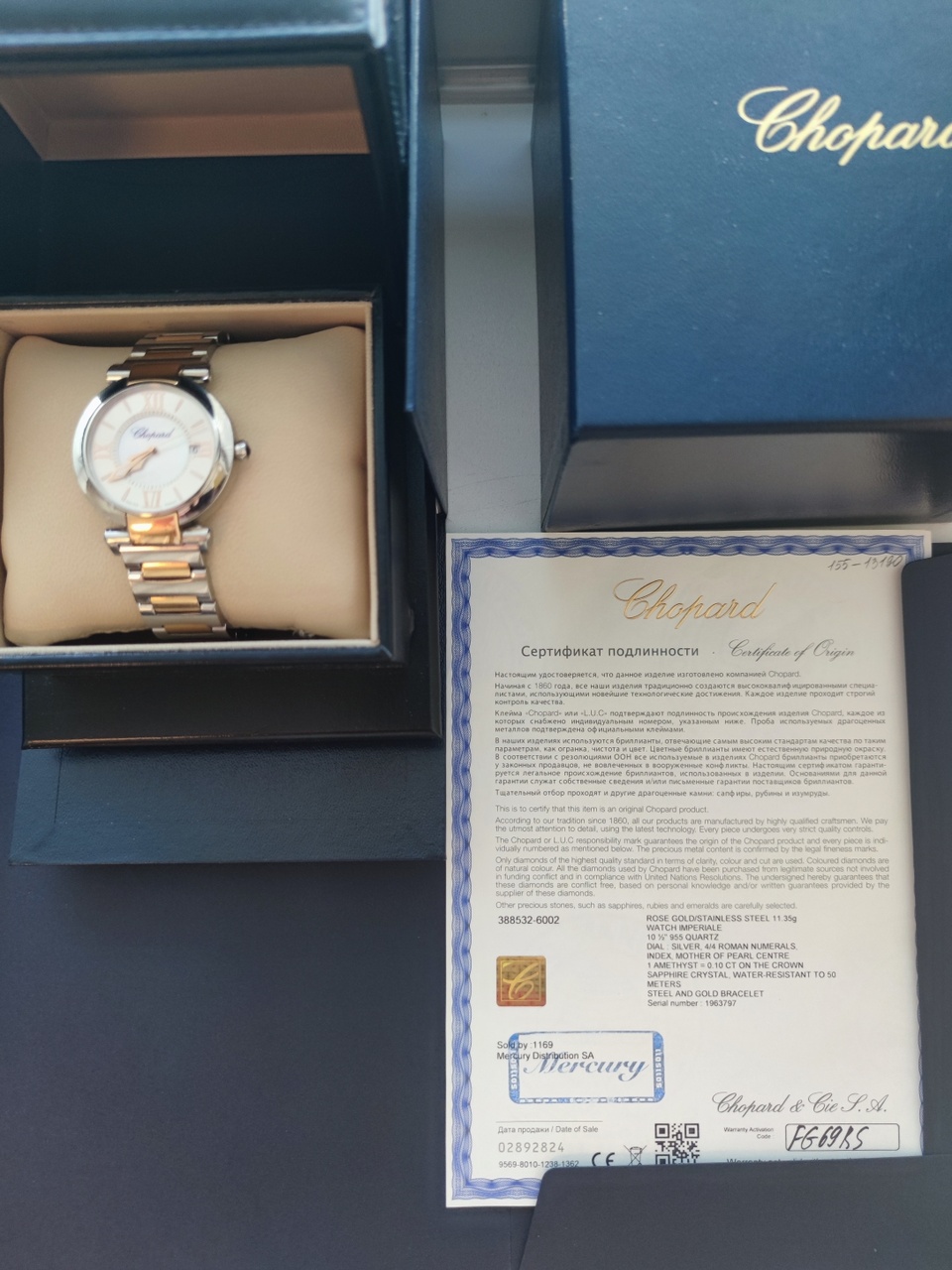 В дизайне и механизме женских часов от Chopard модельного ряда Imperiale соблюдены все современные тенденции часового дела. Эта удивительная смесь порождает новый стиль часов, основанный на вековых традициях, получивших современную интерпретацию. Изготовленный из нержавеющей стали корпус часов, имеет размер 36 мм. Корпус часов толщиной 9 мм. Высокоточный надежный кварцевый механизм не нуждается в подзаводке. Эти часы с водонепоницаемостью 50 м позволят вам плавать в бассейне или принимать душ. Циферблат закрыт прозрачным антибликовым стеклом из сапфирового хрусталя высокой прочности, благодаря чему обеспечивается максимальная защита от сколов и механических повреждений. Браслет выполнен из нержавеющей стали и розового золота и комплектуется раскладывающейся стальной застежкой. Аметистовый кабошон.