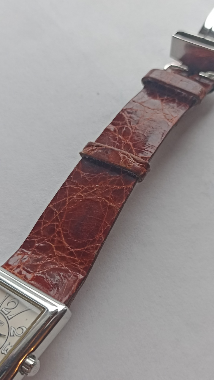 за счёт прямоугольной формы корпуса и родного кожаного ремня с клипсой часы смотрятся роскошно и очень стильно.