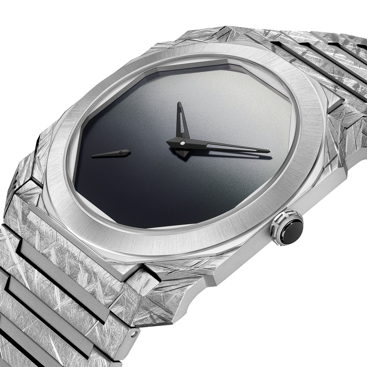 Octo Finissimo – это сложность и глубина, но также и чистота. Корпус, архитектурный и графичный, не похож ни на один другой в часовой индустрии. Гордо опираясь из классические источники, в частности, на восьмиугольную форму Базилики Максенция в Риме, он с той же лёгкостью принимает и современные коды дизайна.