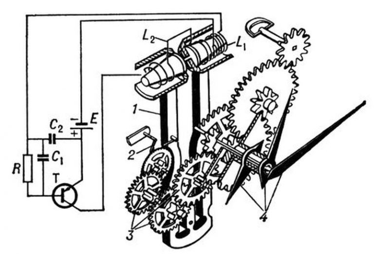 Схема камертонных часов: Т — транзистор; R — резистор; C — конденсатор; L1 — обмотка освобождения; L2 — импульсная обмотка; E — источник питания (гальванический элемент); 1 — камертон; 2 — храповый механизм; 3 — колёсная передача; 4 — стрелки.