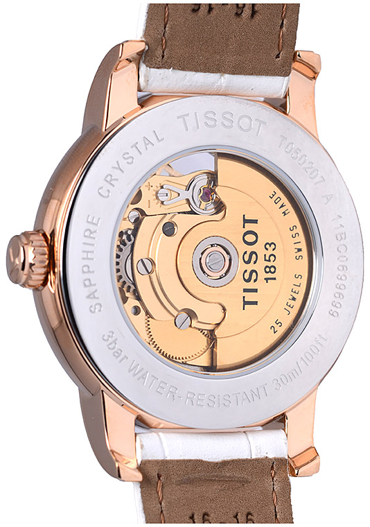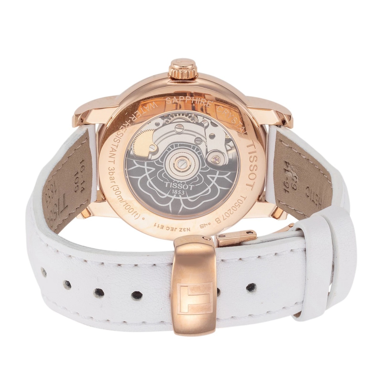 Предлагаю женские T0502073601701 T-Lady женские автоматические часы Lady Heart с бриллиантами. Корпус из нержавеющей стали с PVD-покрытием из розового золота с бриллиантами белым кожаным ремешком. Безель с PVD-покрытием из розового золота с бриллиантами. Циферблат из белого перламутра ("открытое сердце") со стрелками в стиле альфа из розового золота и часовыми метками. Тип циферблата: аналоговый. Механизм с автоподзаводом Tissot Calibre Powermatic 80.601, созданный на базе Tissot calibre Powermatic 80, с 23 драгоценными камнями, имеет запас хода около 80 часов.Сапфировое устойчивое к царапинам стекло. Заводная головка с выдвижной головкой .Задняя крышка прозрачная. Круглая форма корпуса. Размер корпуса: 35 мм. Толщина корпуса: 9,35 мм. Ширина ремешка: 16 мм. Раскладывающаяся застежка. Водонепроницаемость на расстоянии 30 метров / 100 футов. Функции: часы, минуты, секунды. Swiss Made. Женские часы Tissot Lady Heart Powermatic 80 с перламутровым циферблатом с бриллиантами