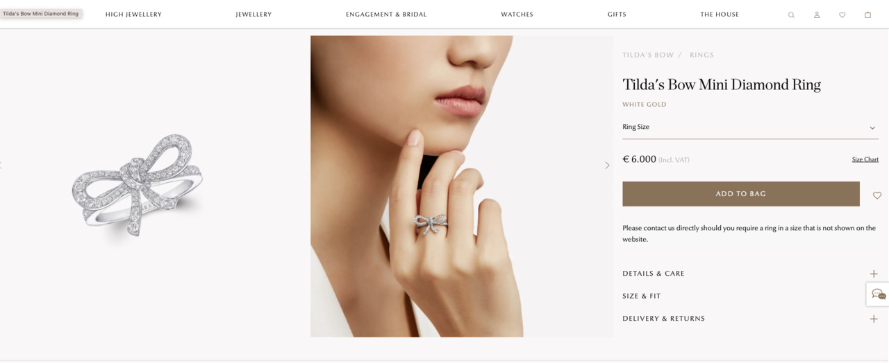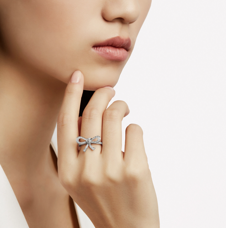 Коллекция Tilda's Bow включает в себя сияющие бриллиантовые банты, представленные на миниатюрных подвесках, серьгах-гвоздиках и нежных бриллиантовых кольцах, а также выразительных интерпретациях высоких ювелирных изделий с культовым мотивом банта, который занимал видное место на протяжении всей истории.