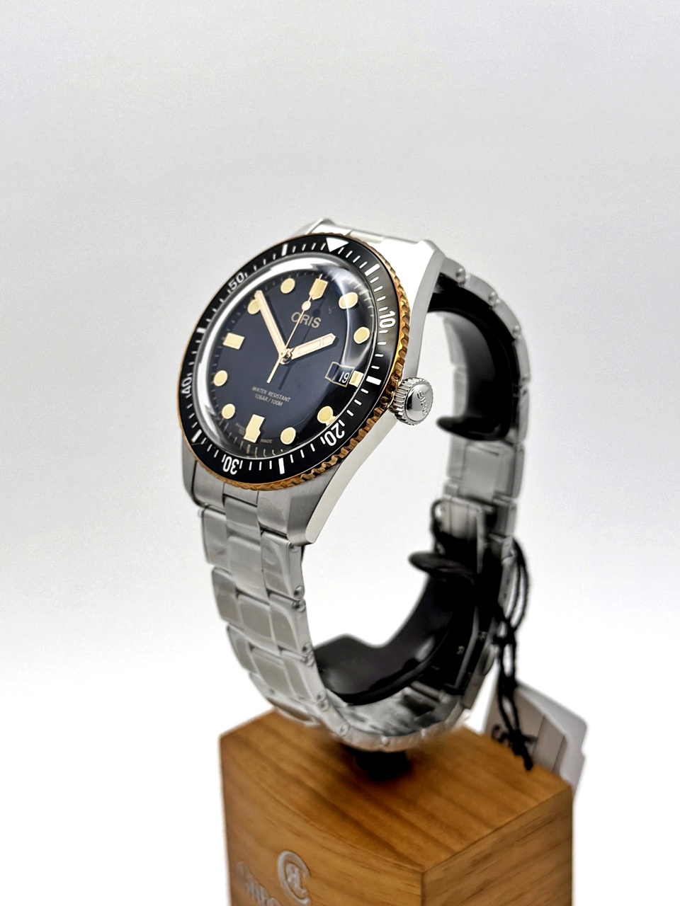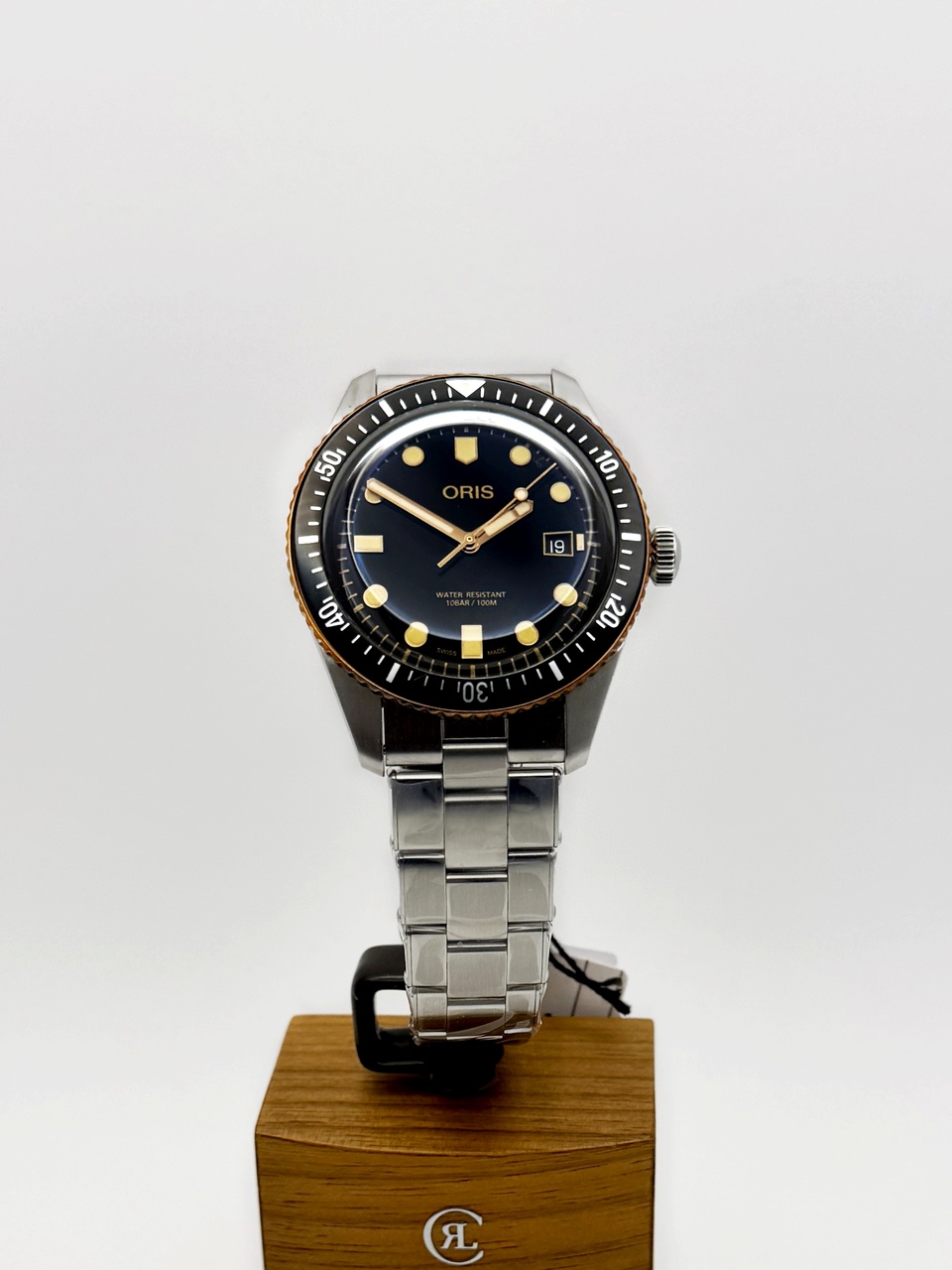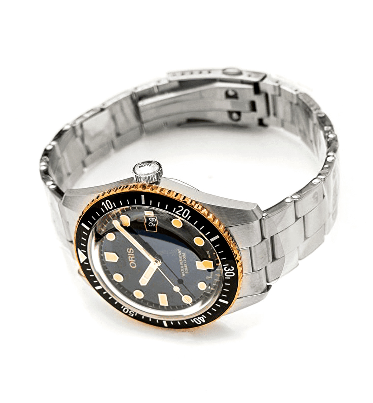 Двояковыпуклое сапфировое стекло с внутренним антибликовым покрытием, задняя крышка со специальной гравировкой, завинчивающаяся заводная головка, швейцарский автоматический механизм, бронзовый безель, всё это соединено в культовых дайверских часах, впервые появившихся в коллекции Oris 60 лет назад. Уникальный дайверский аксессуар в ретро-стиле поворачивает время вспять, позволяя их обладателю стать причастным к незабываемым вехам в истории часов Oris.